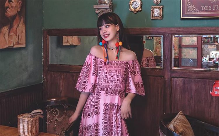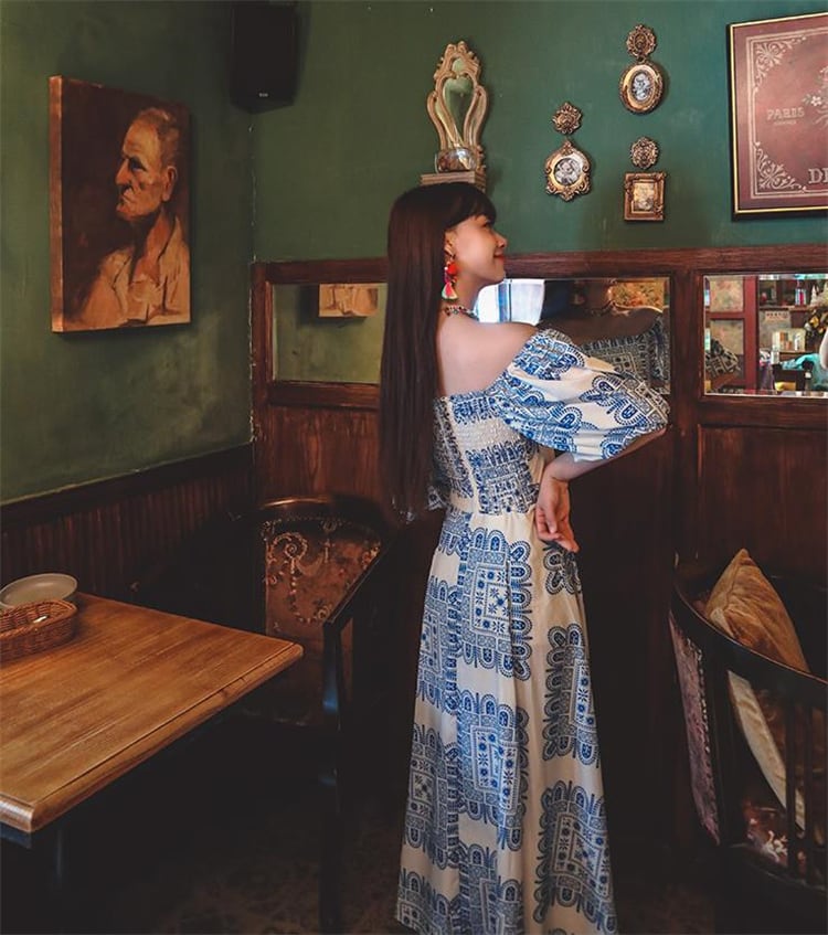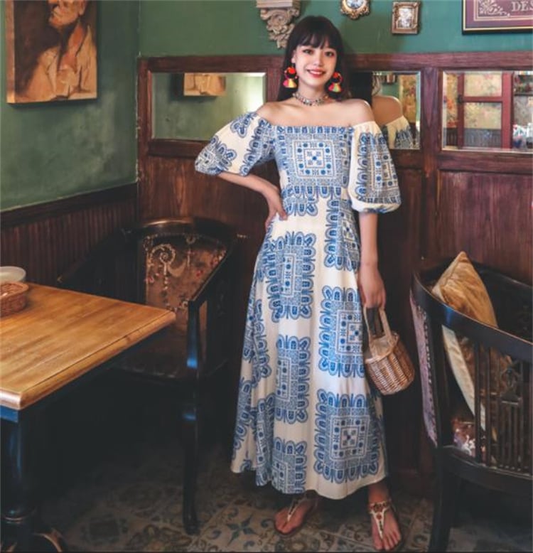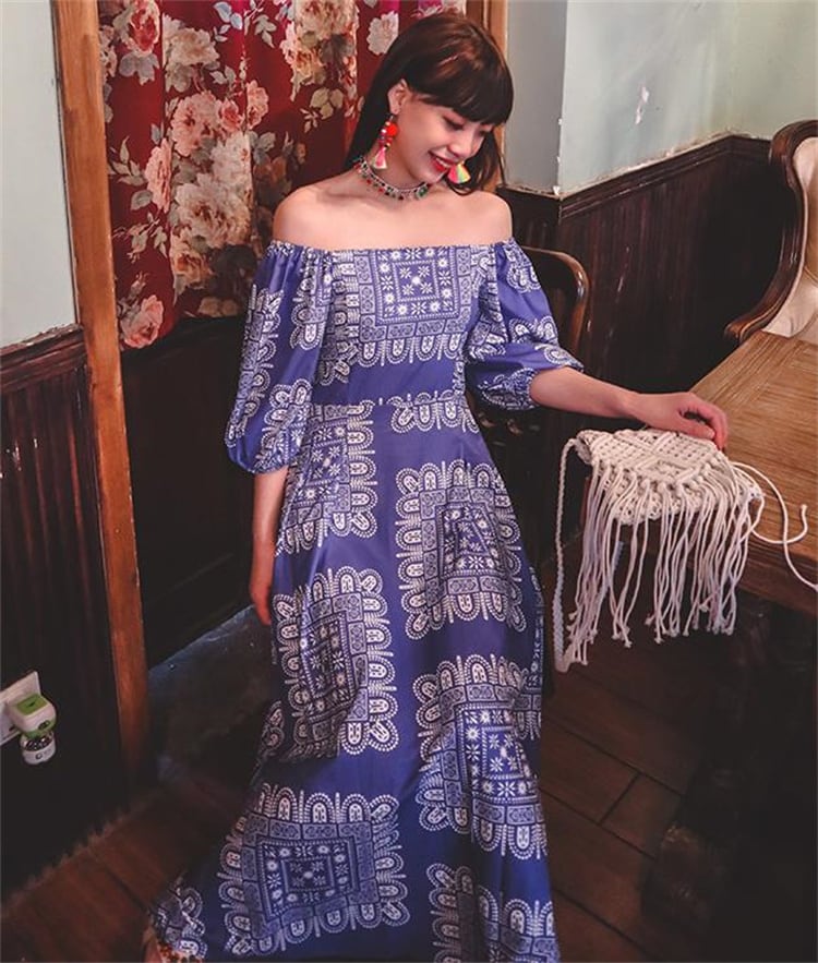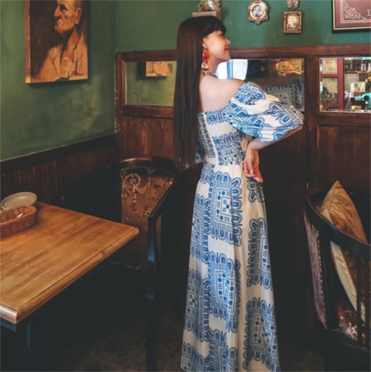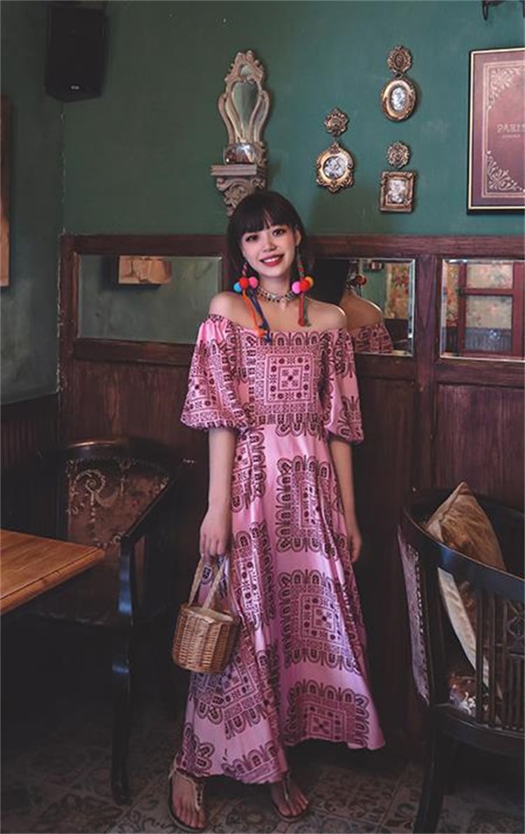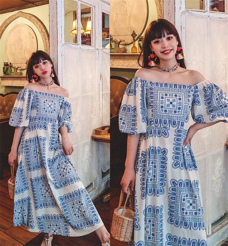 ボヘミアン ロングスカート パフスリーブ ワンショルダー レトロ プリント ワンピース