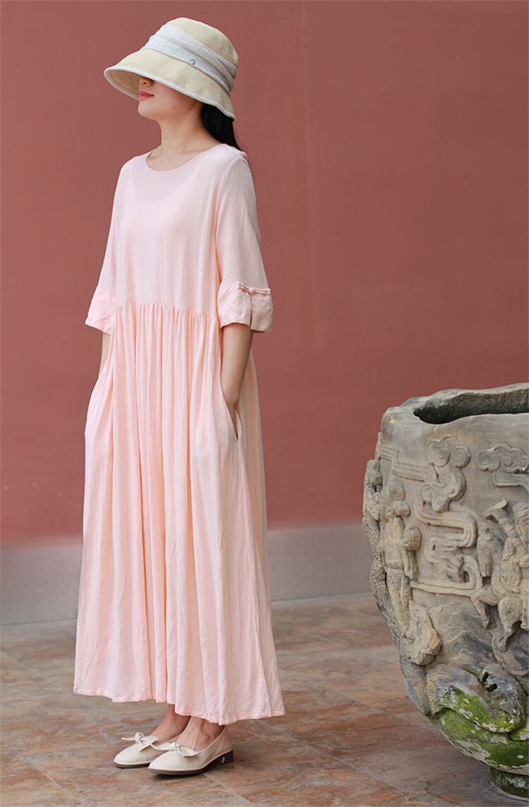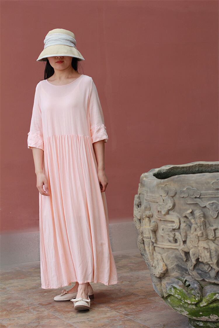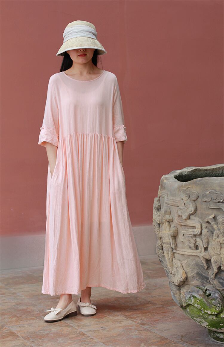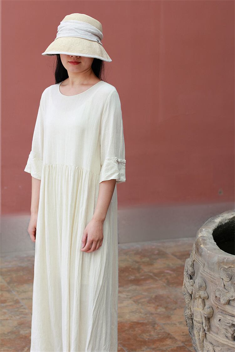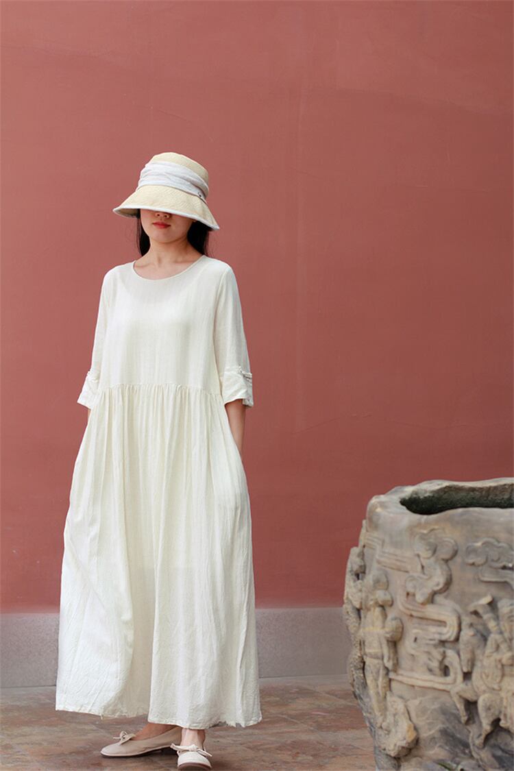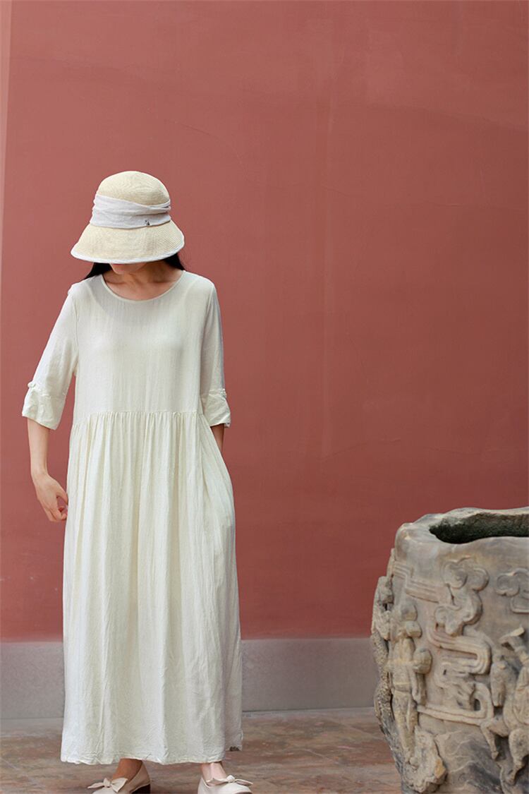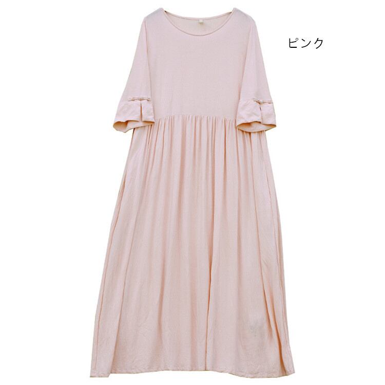 コットンリネン ミドルスリーブ ボタン ワンピース ラウンドネック ゆったりする ロングスカート