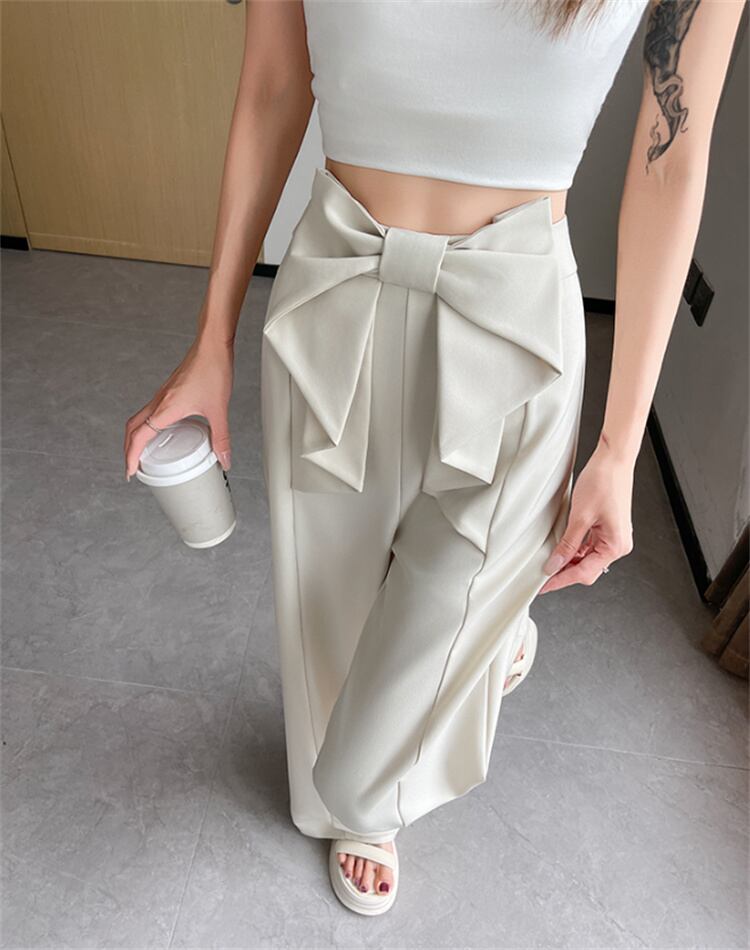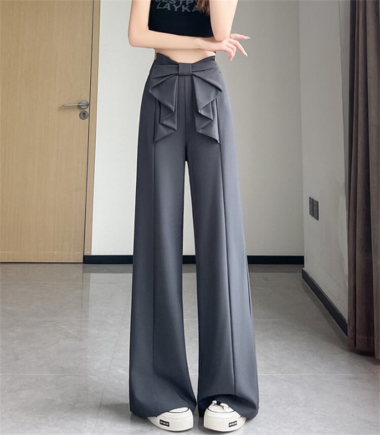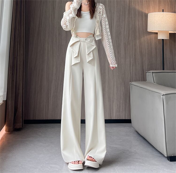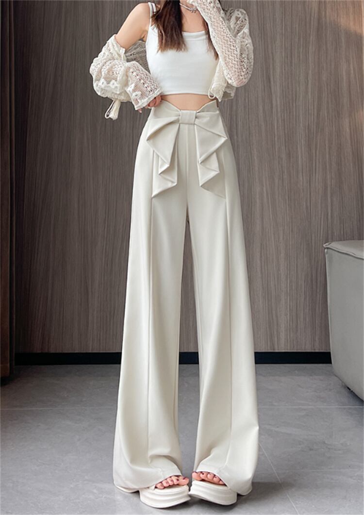 夏のオフィスパンツ ひも飾り ストレート脚ライン ゆったり丈(ハイウエスト)
