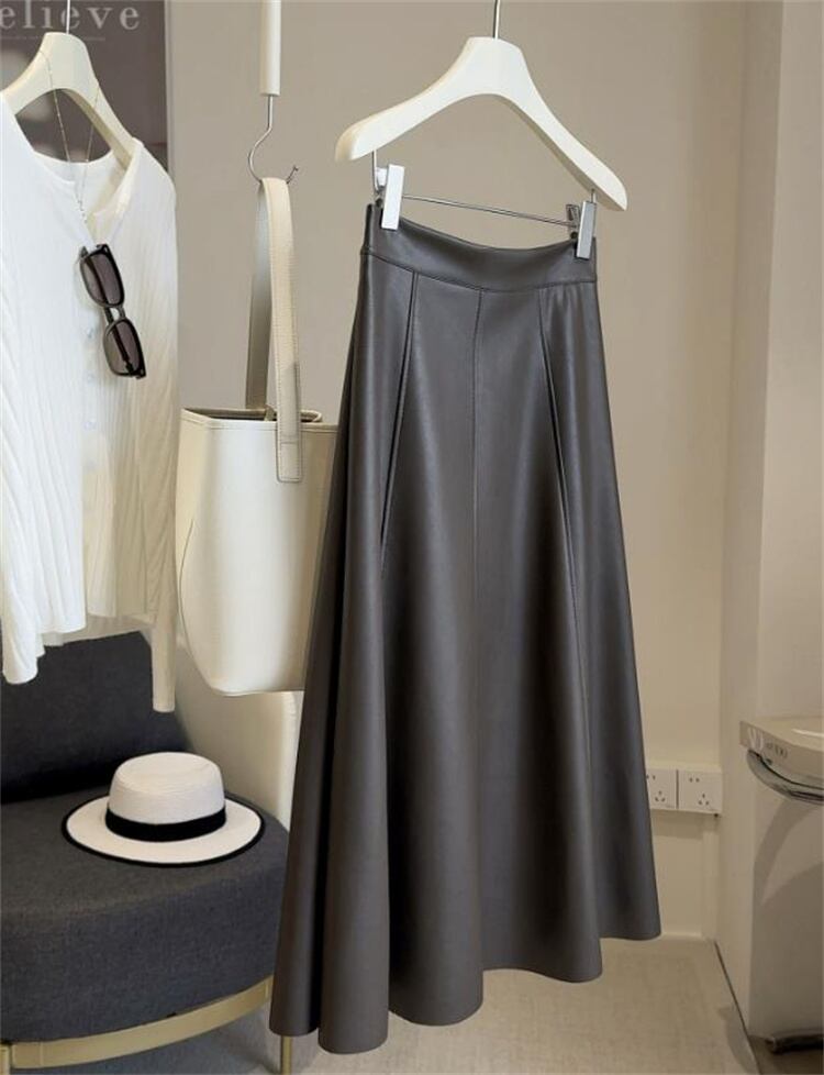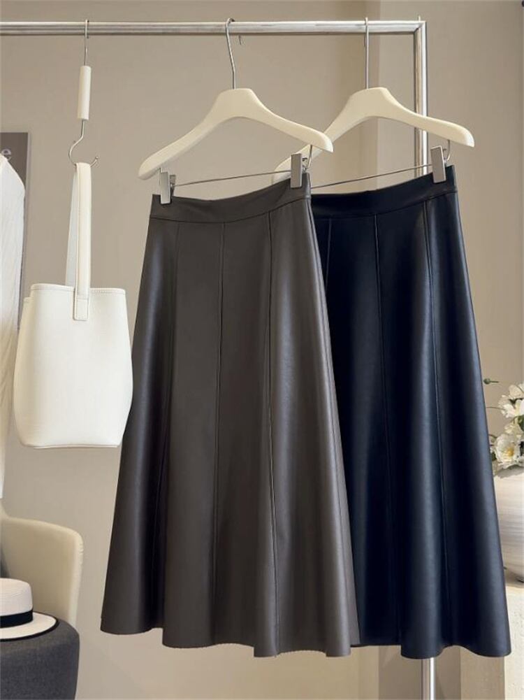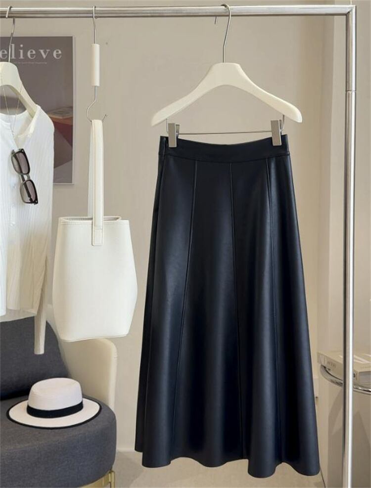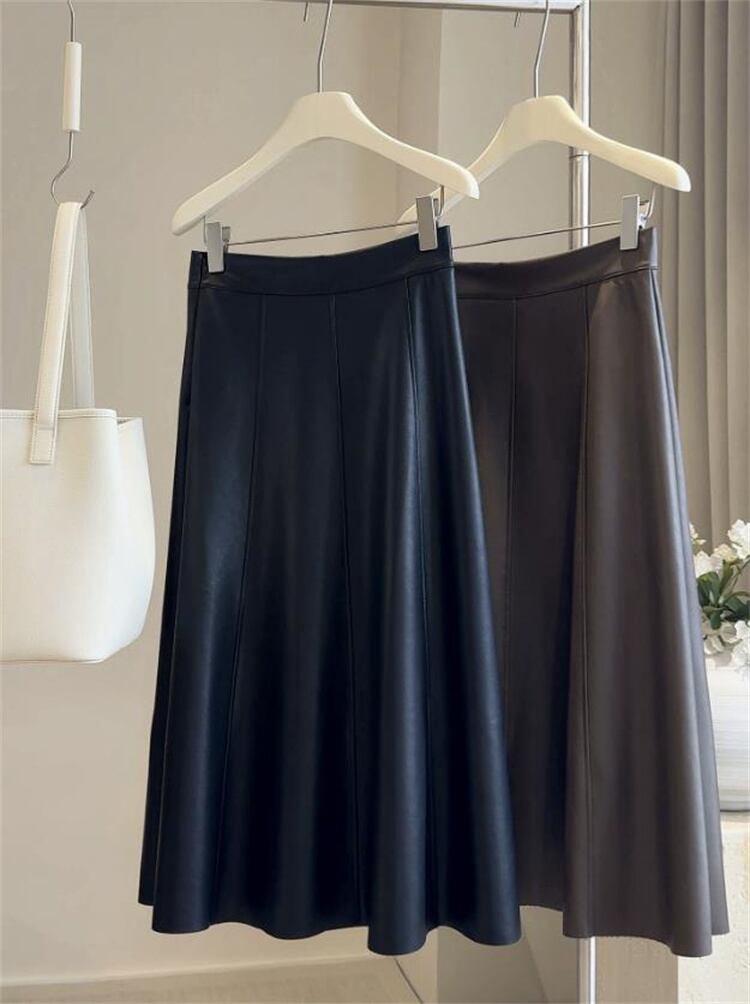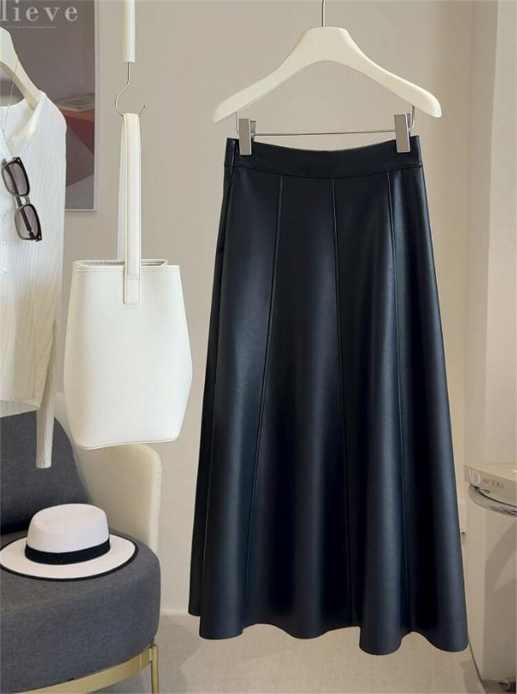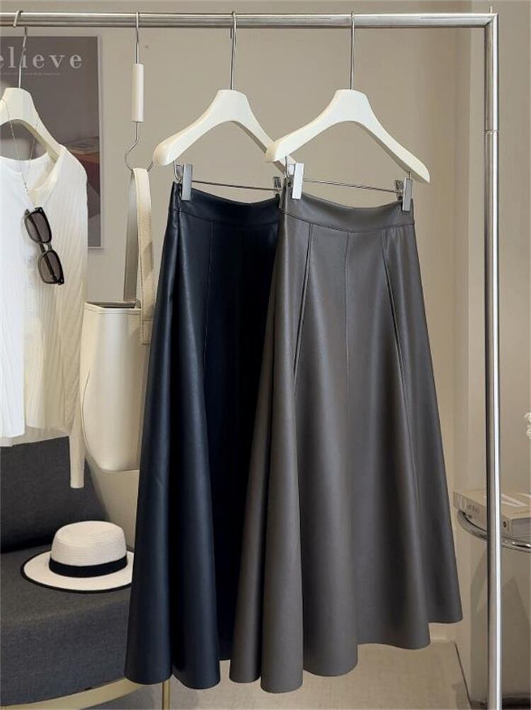 秋新作 PU素材 ハイウエストAライン ロングフレアスカート