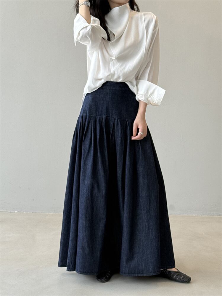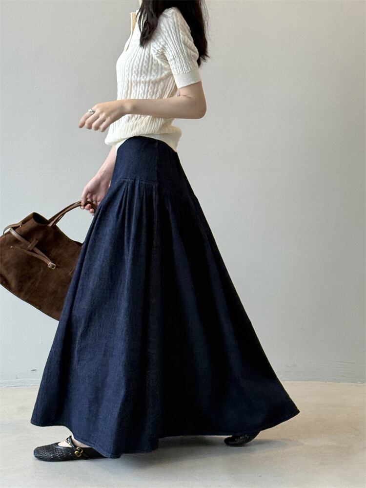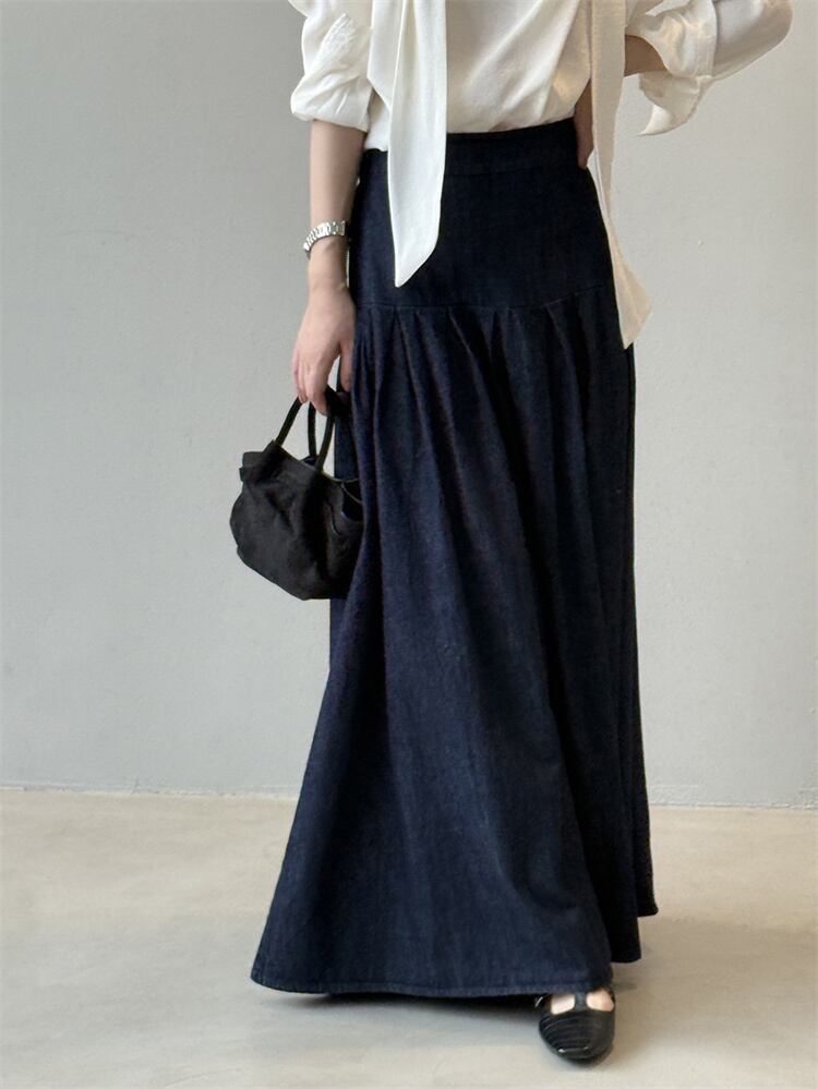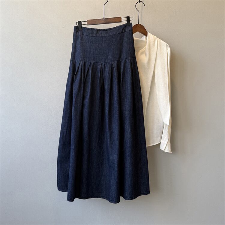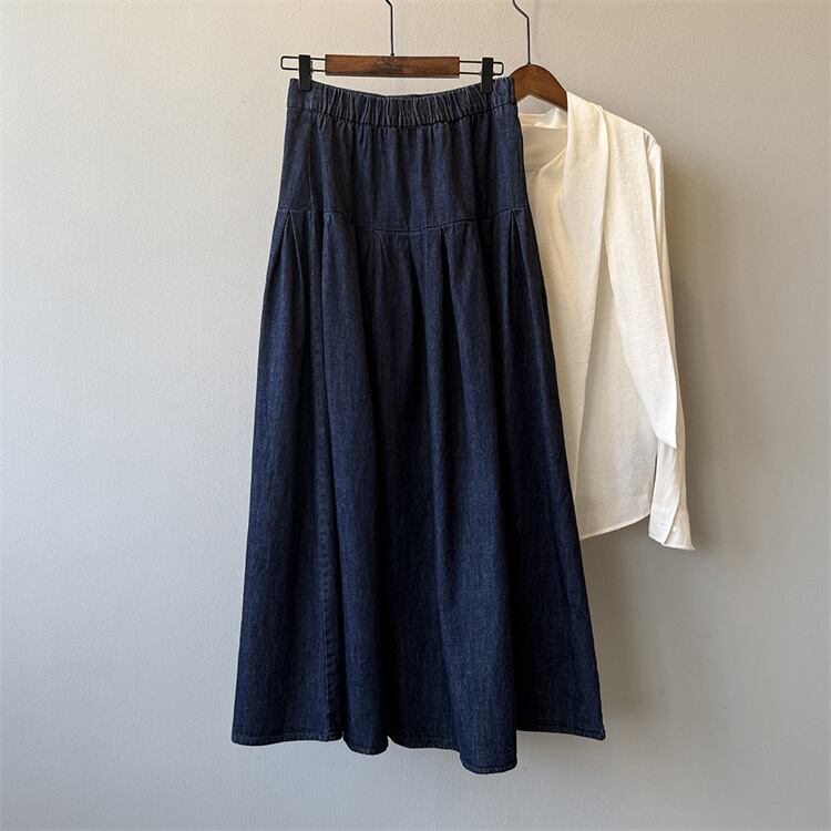 2025秋 デニムハーフスカート レトロルーズフィット ハイウエスト Aラインロングスカート
