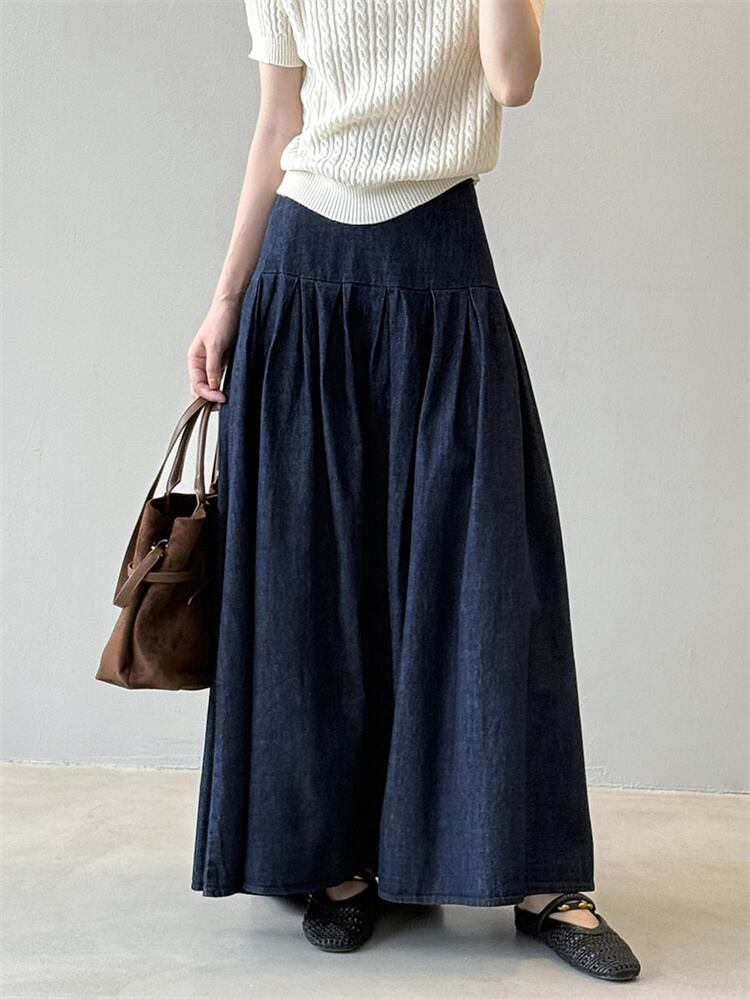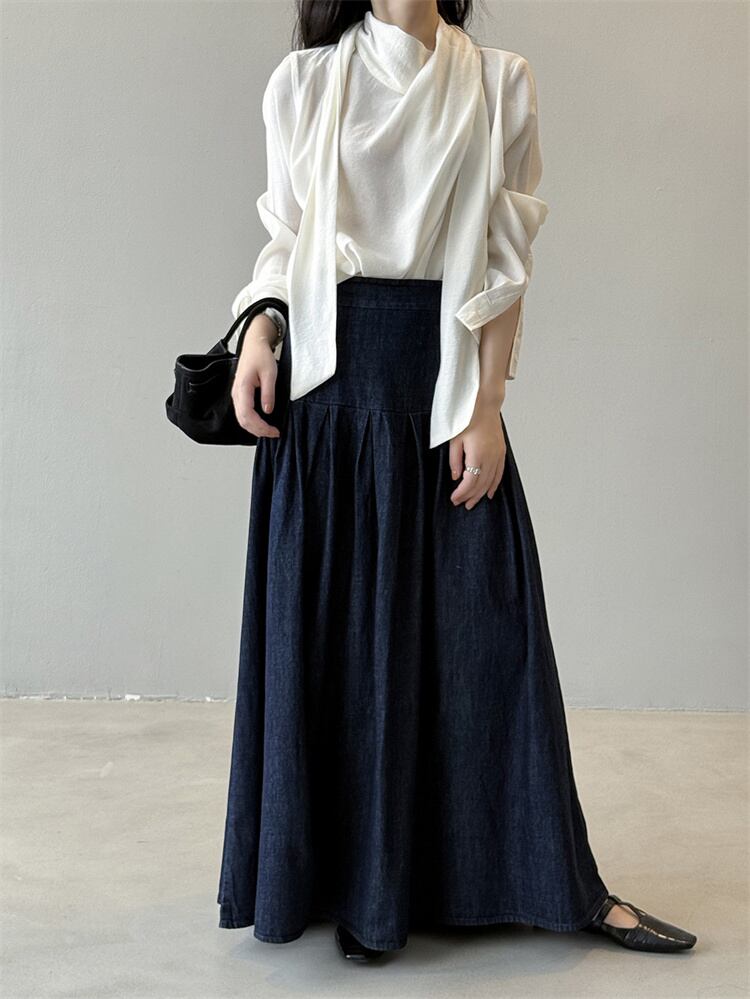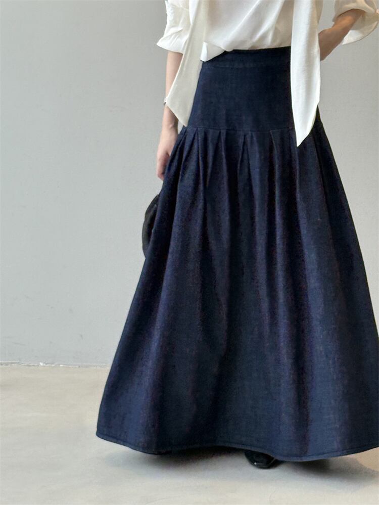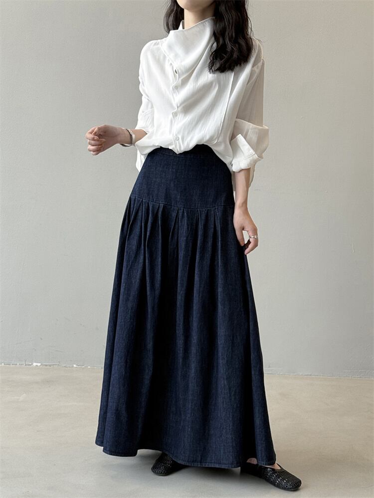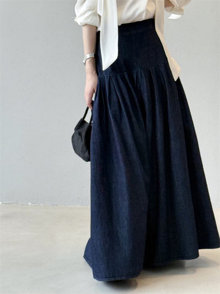 2025秋 デニムハーフスカート レトロルーズフィット ハイウエスト Aラインロングスカート