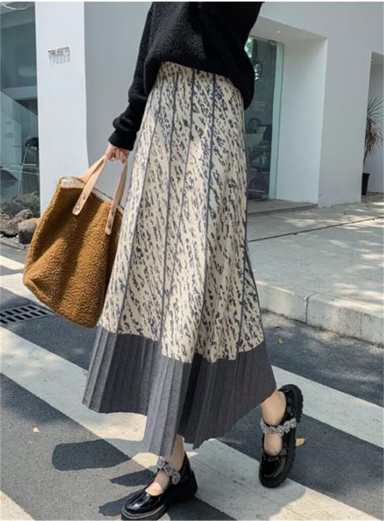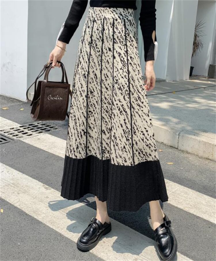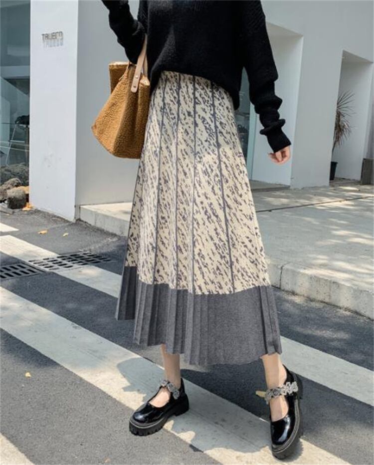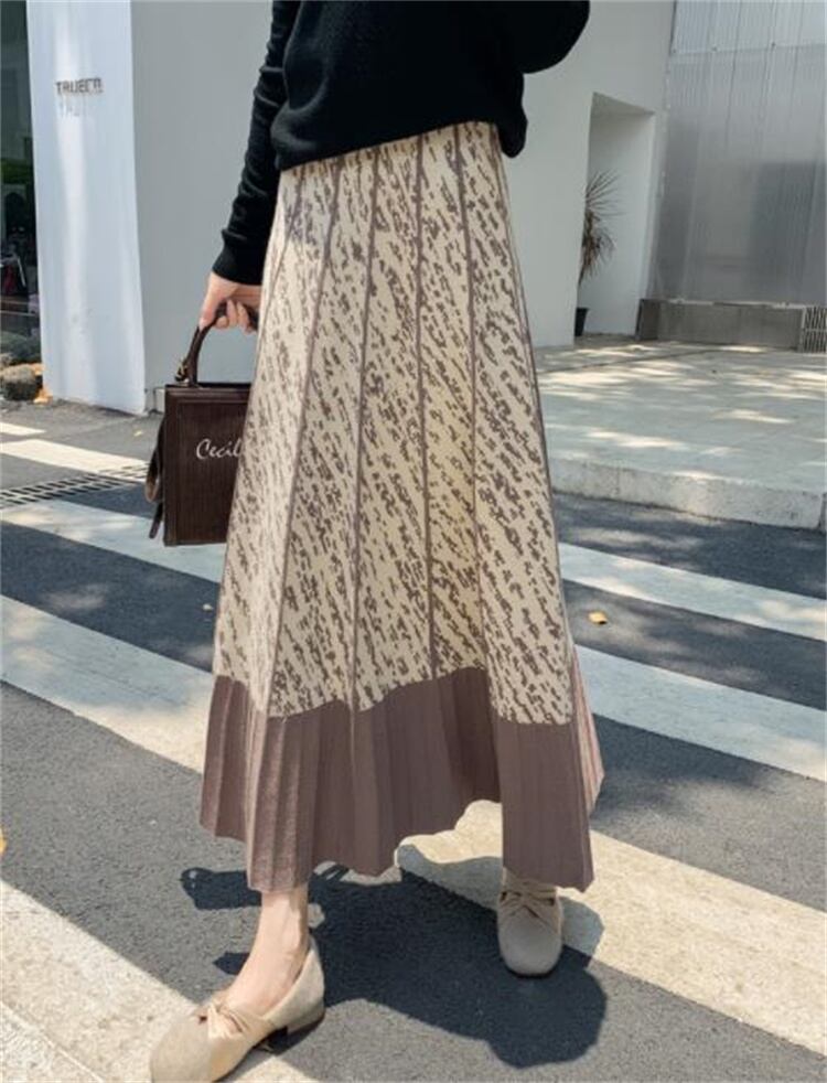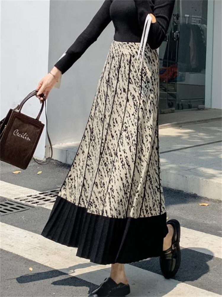 ロングスカート 秋 Aライン プリント 大きい裾 スリム 中丈 傘スカート