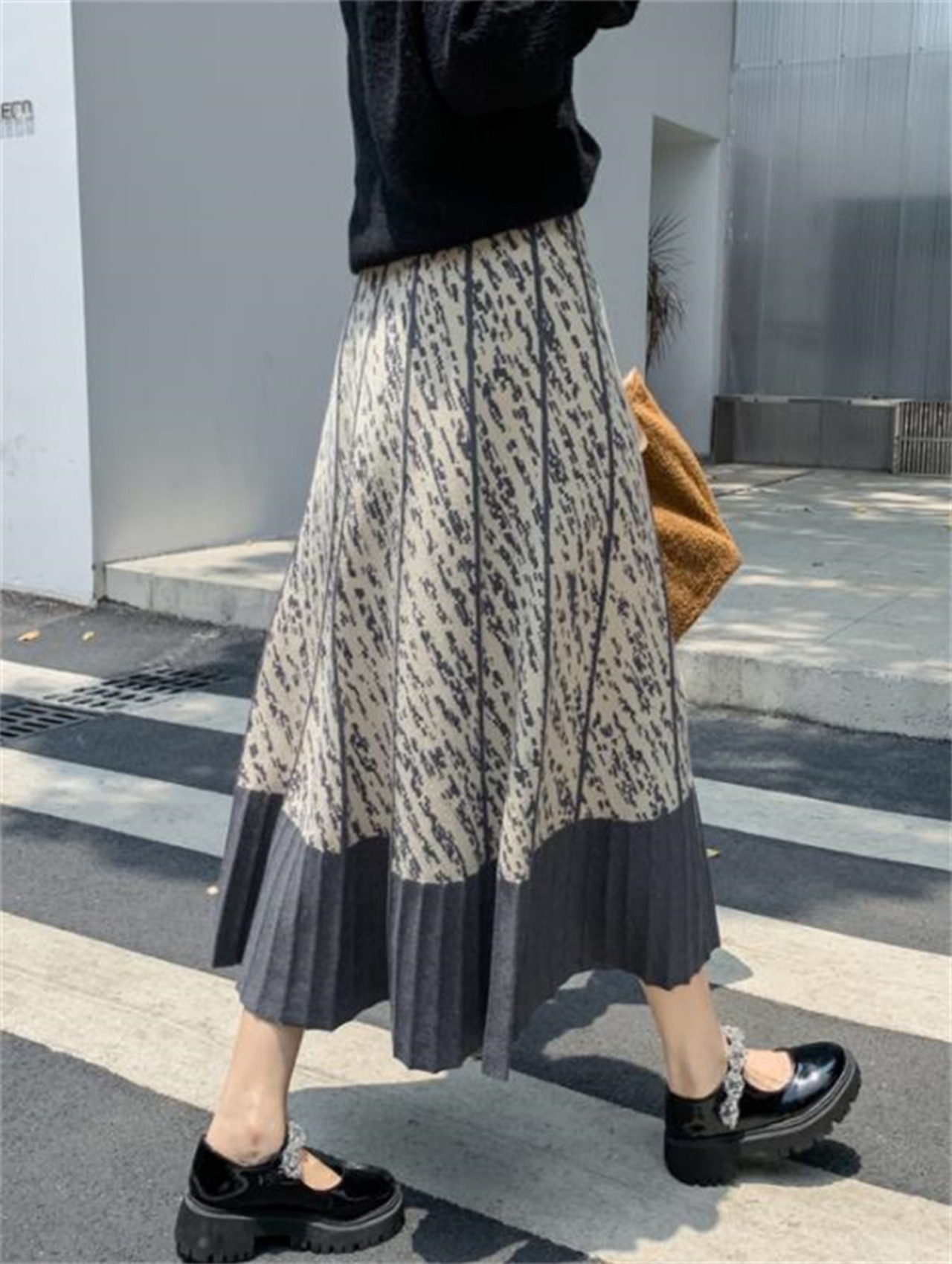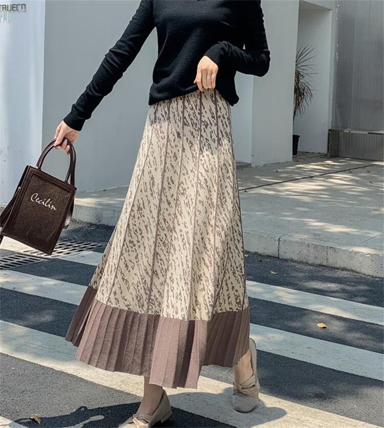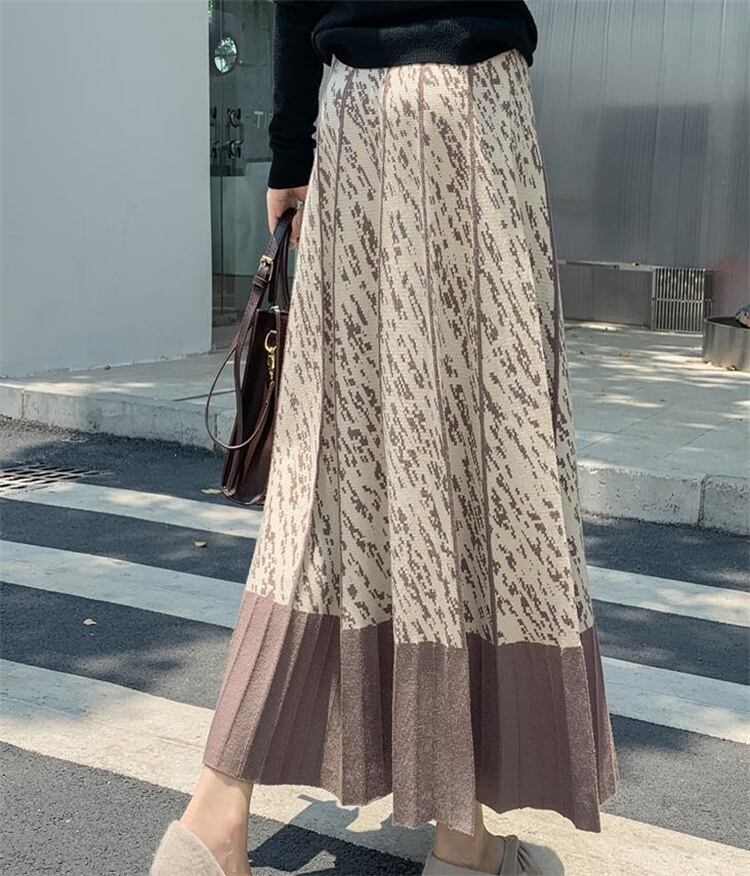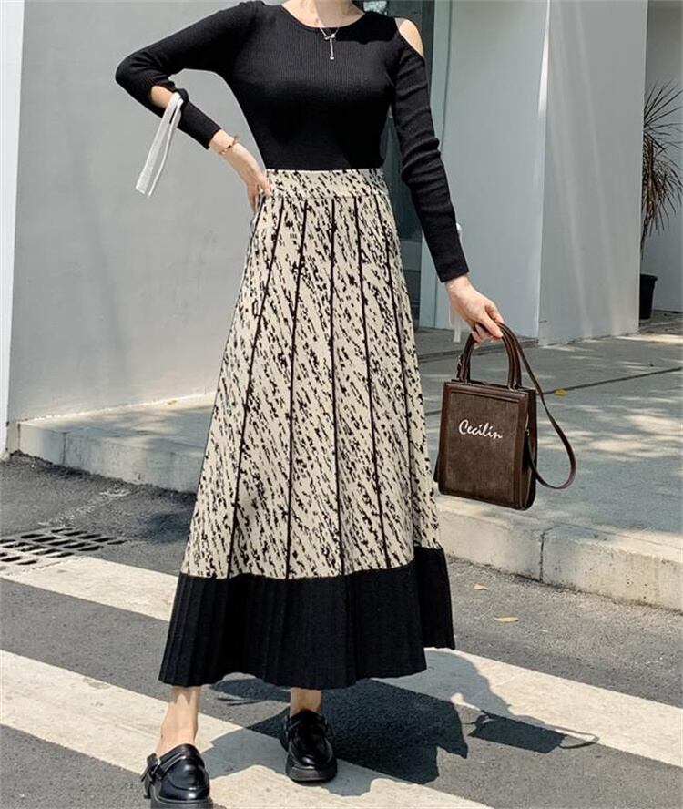 ロングスカート 秋 Aライン プリント 大きい裾 スリム 中丈 傘スカート