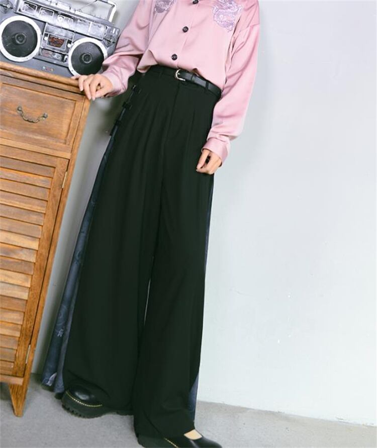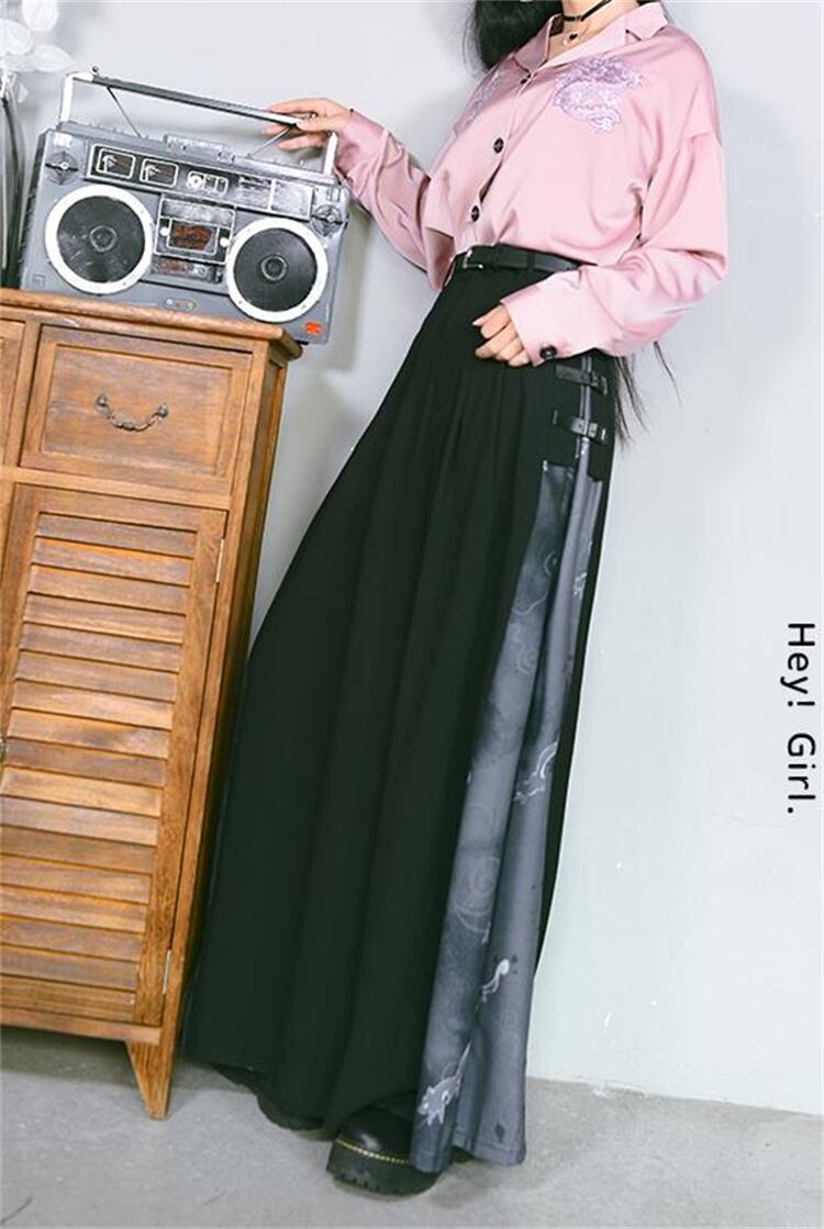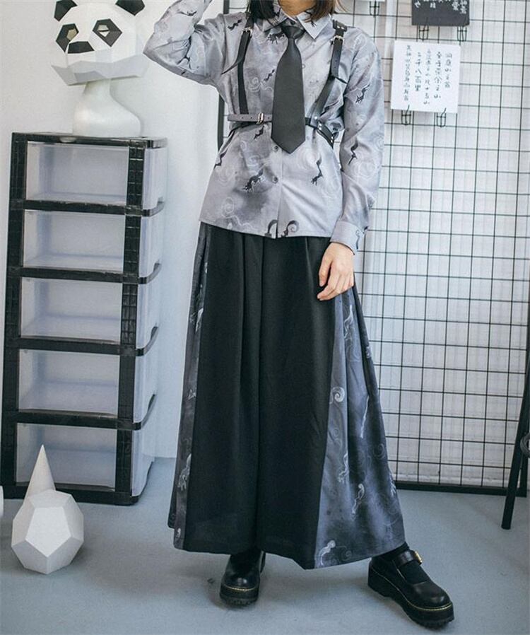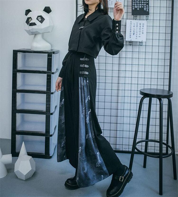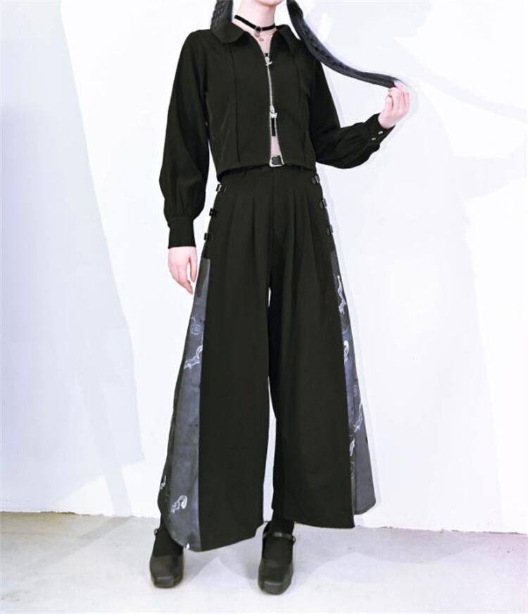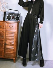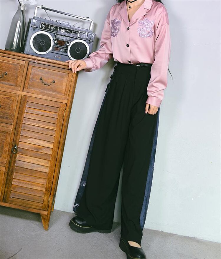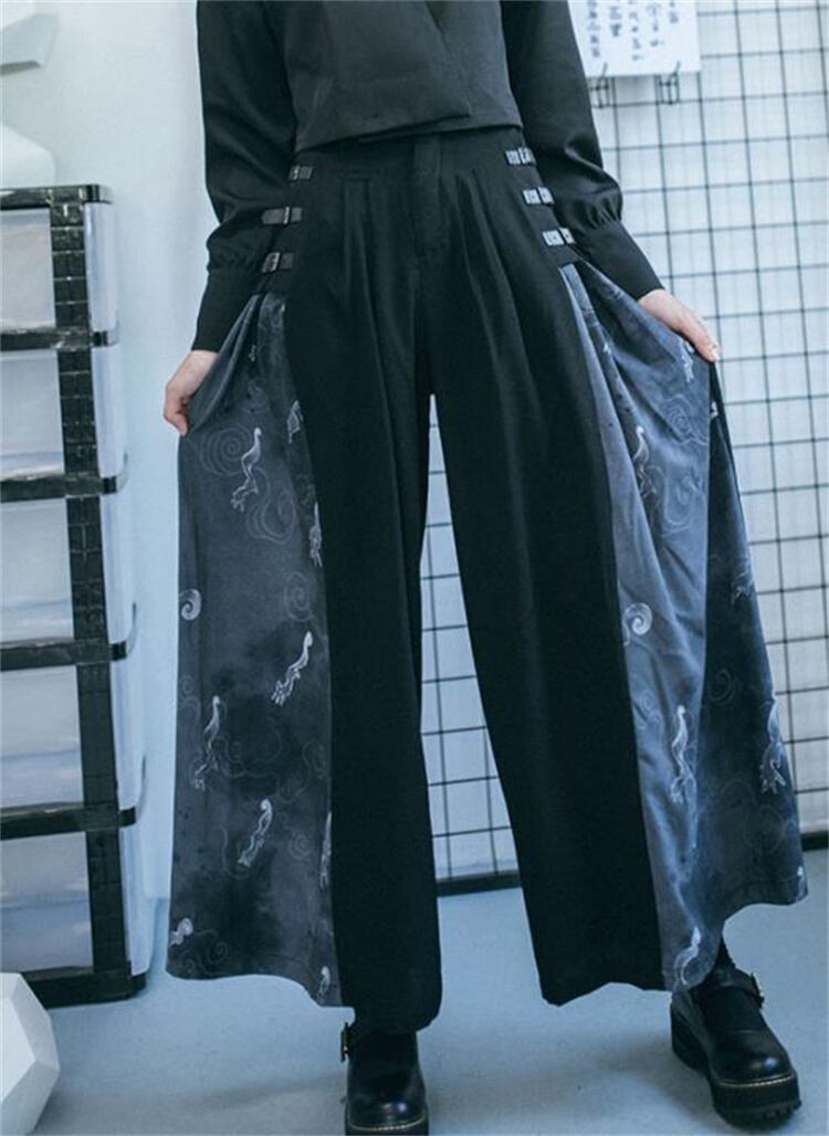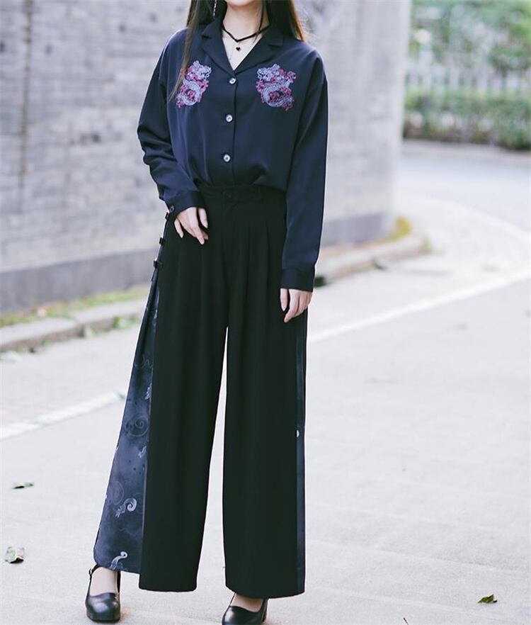 ロングパンツ 柄パンツ ドレープ 新中国風 改良 秋 ワイドパンツ 黒いロンパン 狐影シリーズ