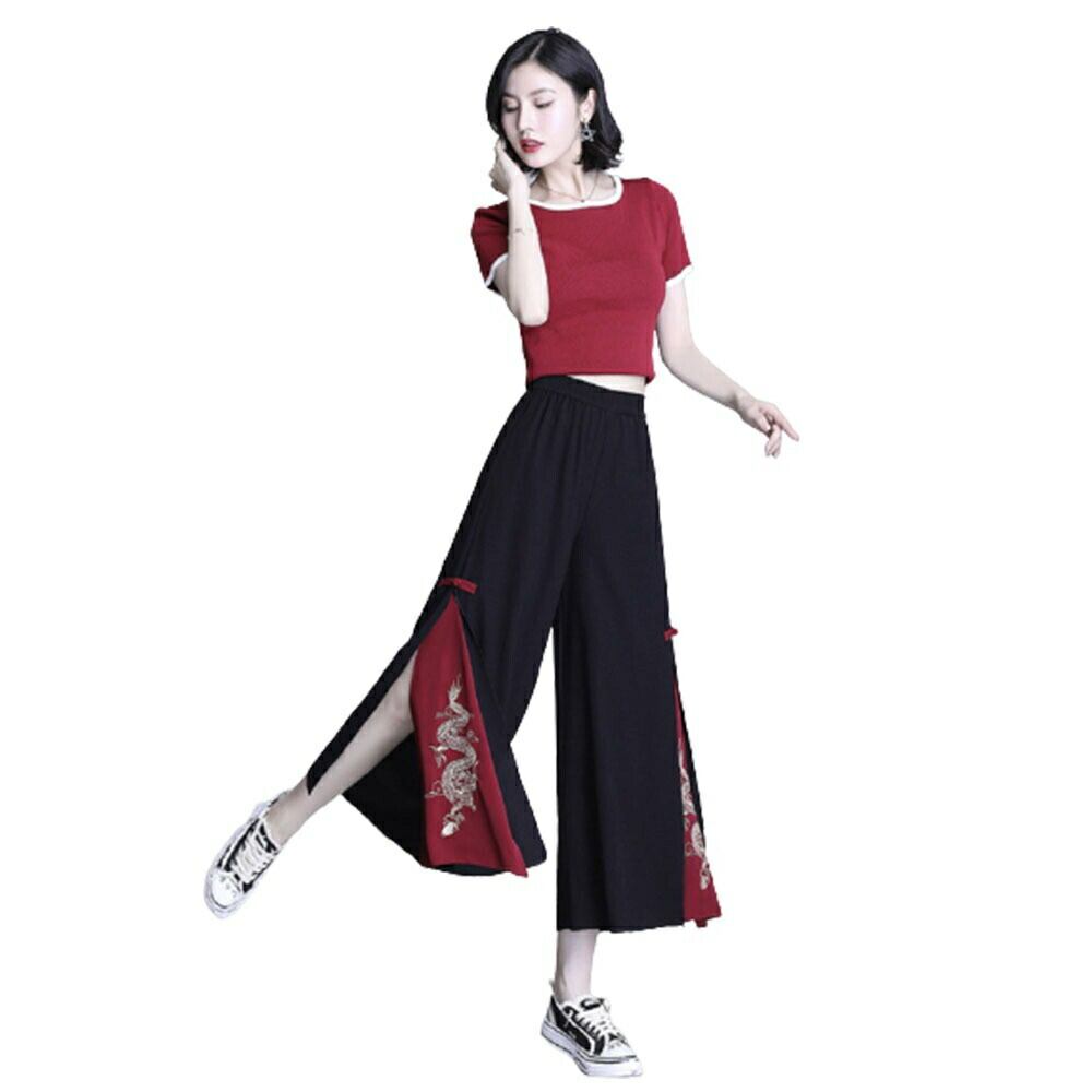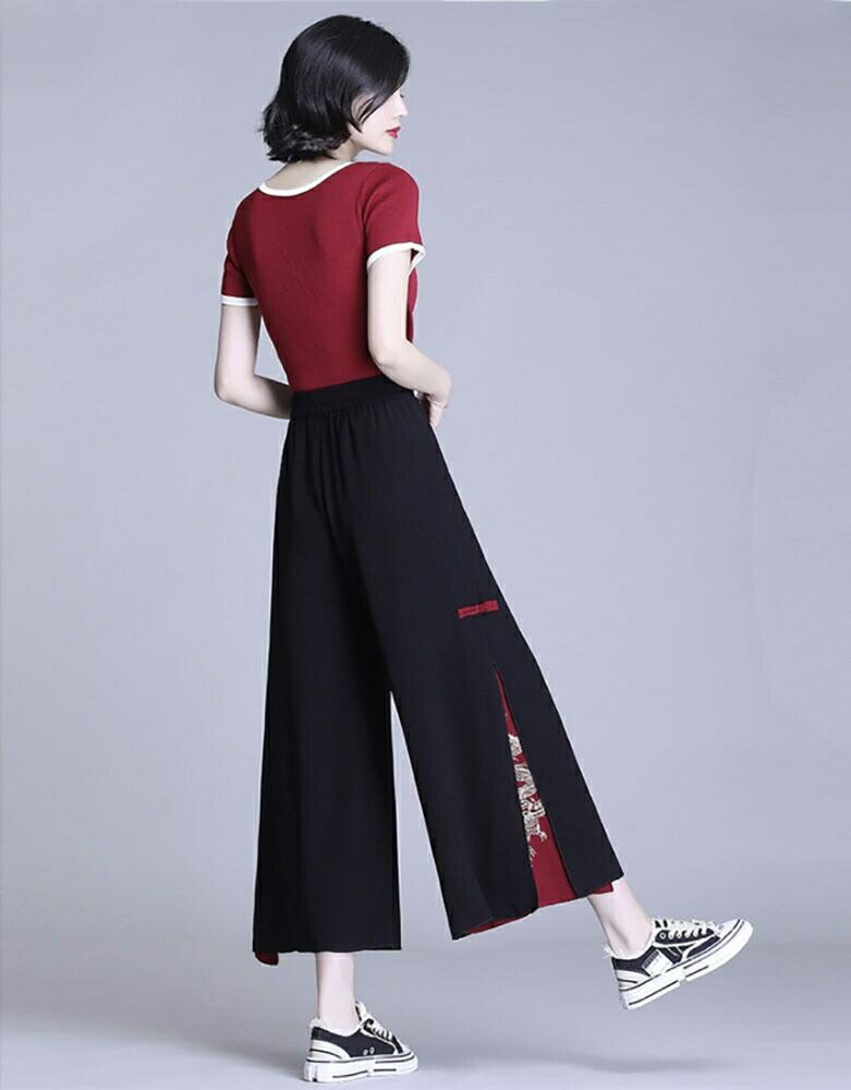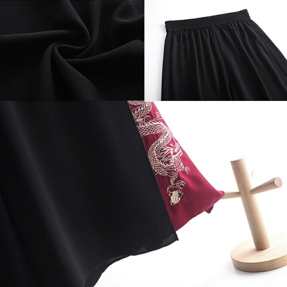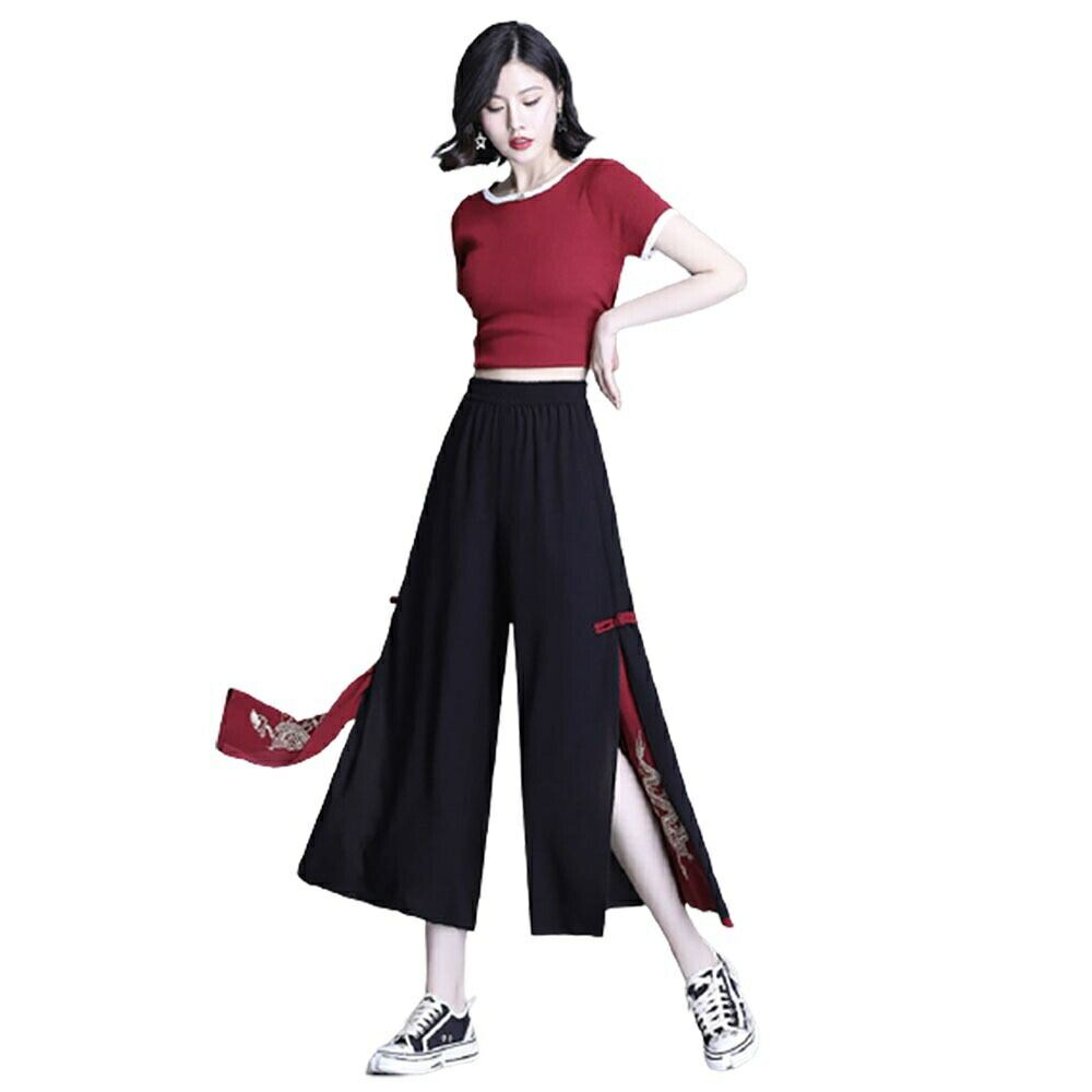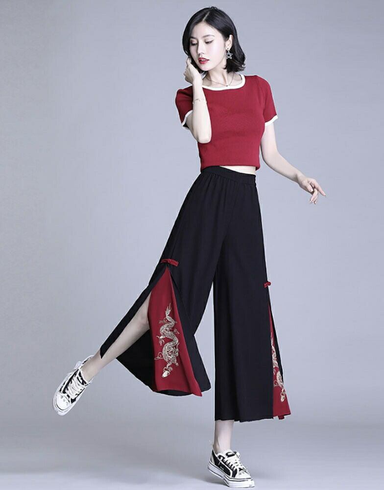 動くたびに広がるワイドシルエットの裾から、赤地にゴールド刺繍の龍柄がちらりと覗き、上品さと華やかさを兼ね備えています。