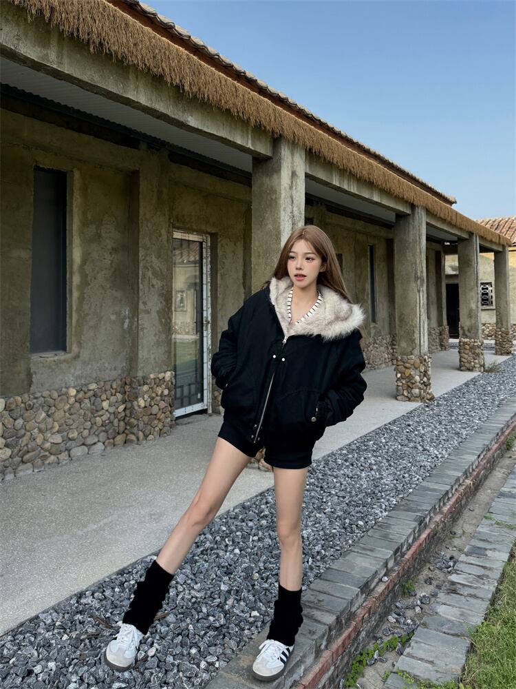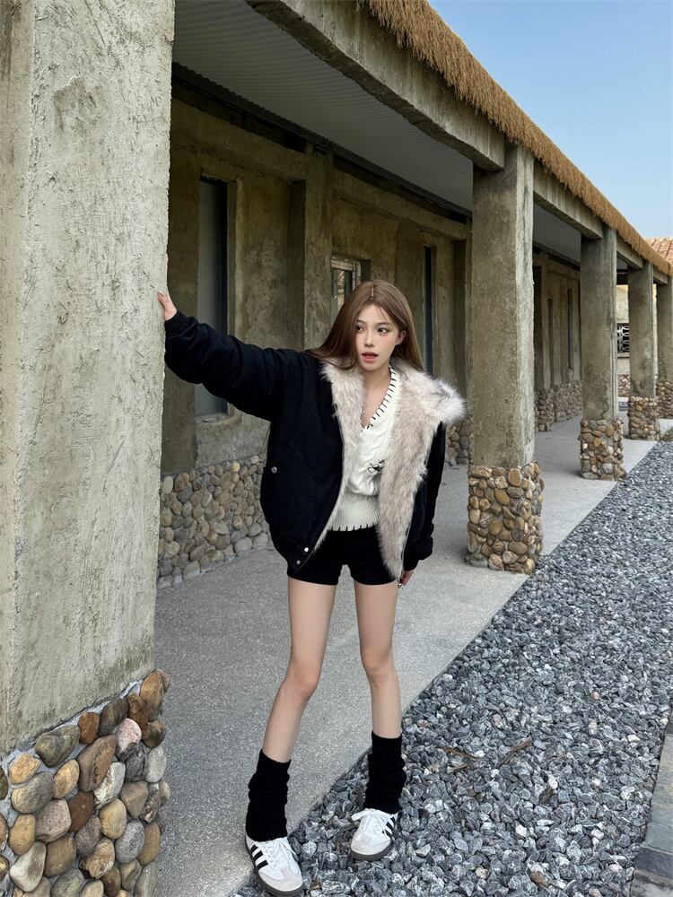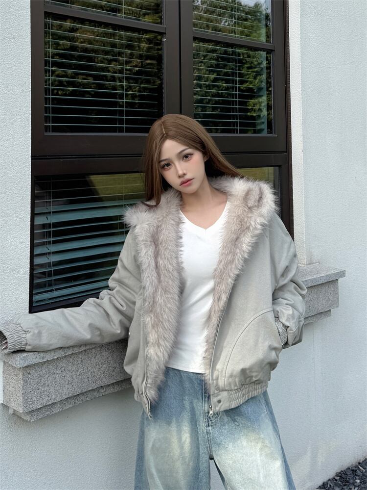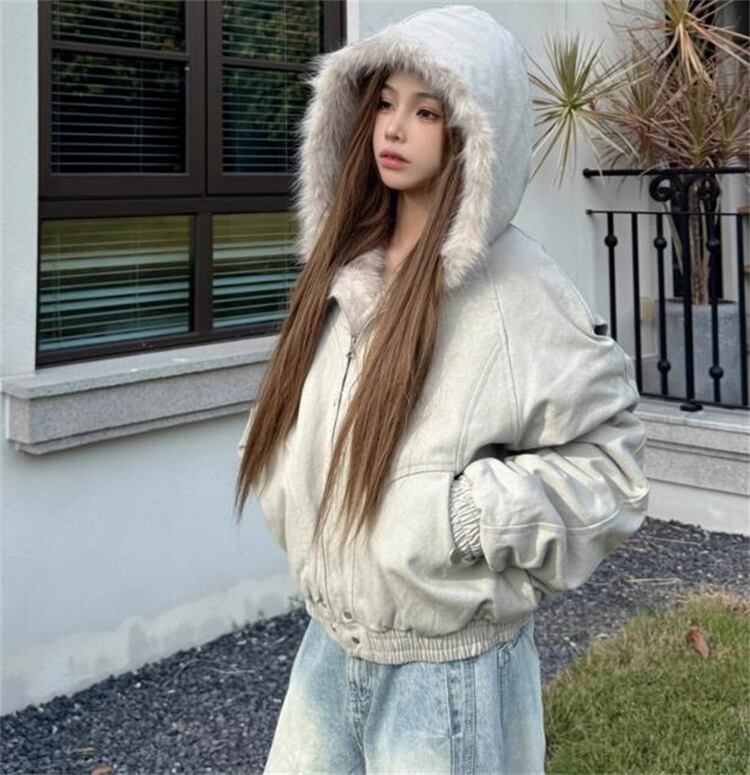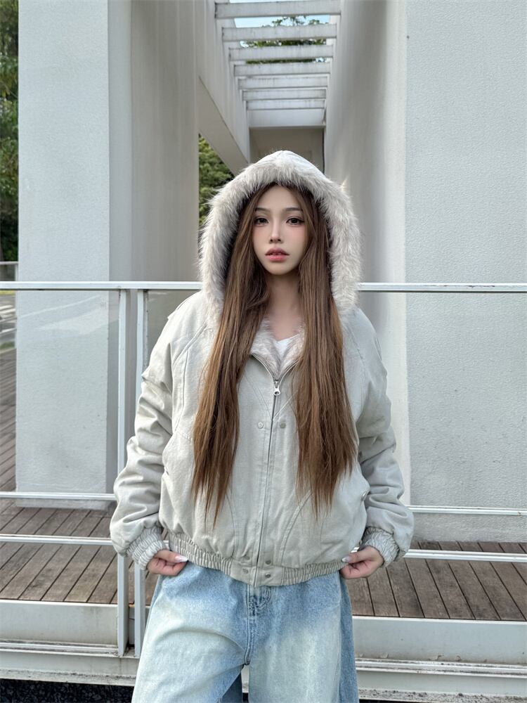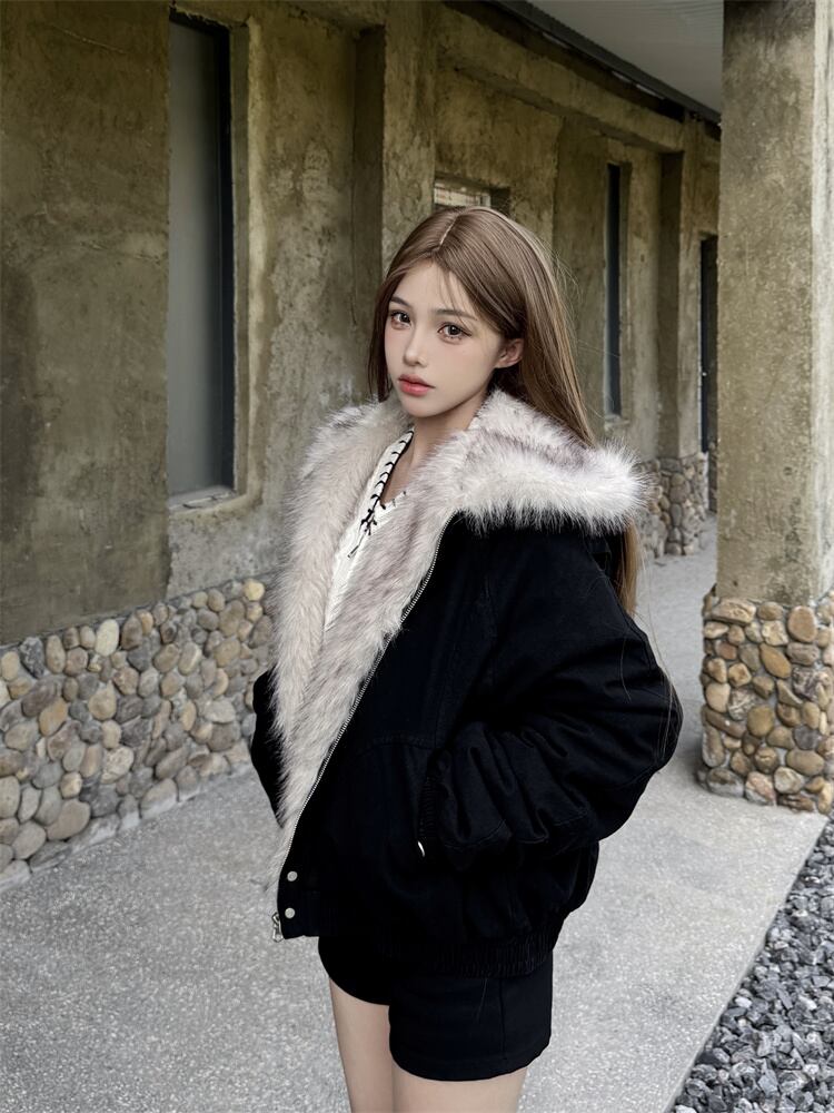 2025年冬 ショート丈 保温厚手 ペア用 毛皮付き襟 コットンコート ゆったり