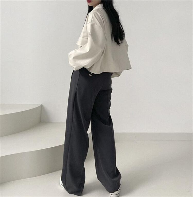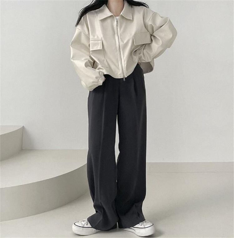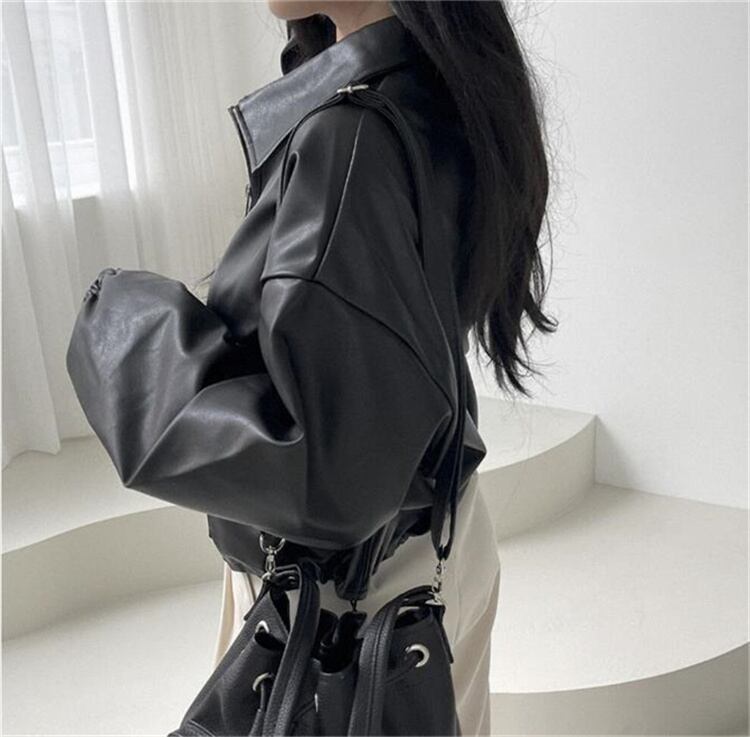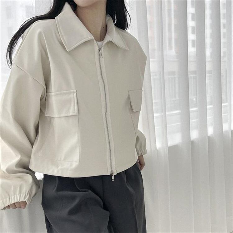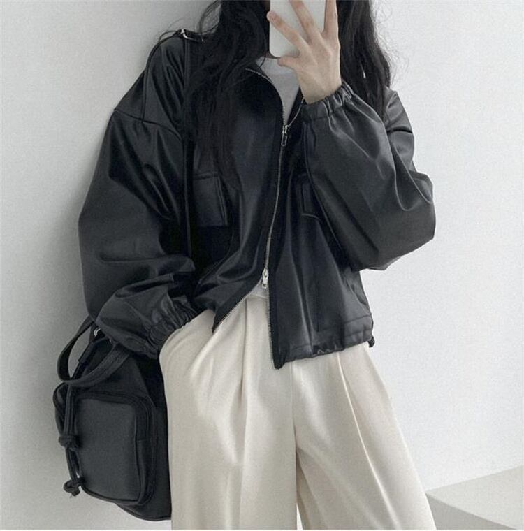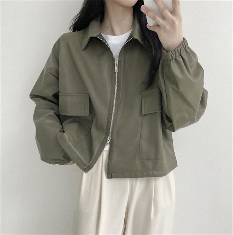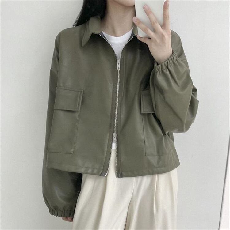 シンプルで実用的 調節可能なひも 広めポケット ダブルファスナー 長袖レザートップス