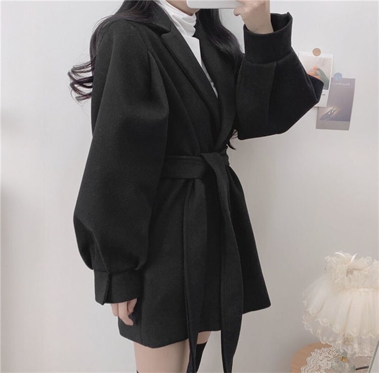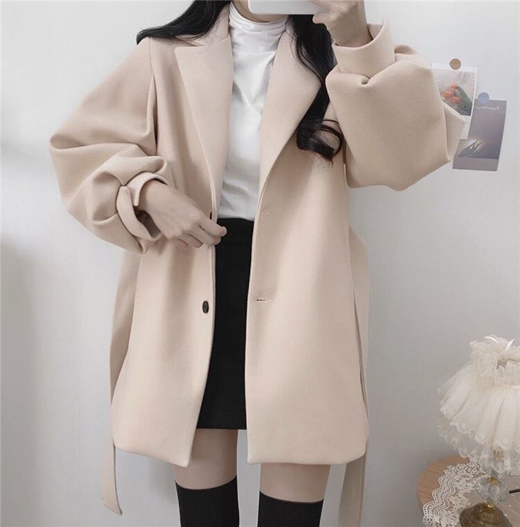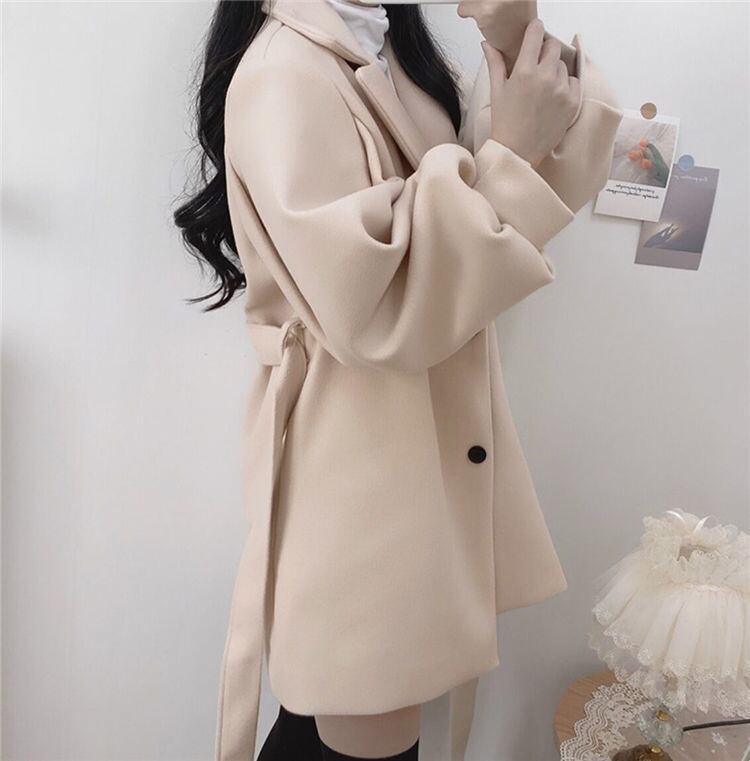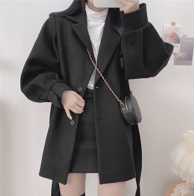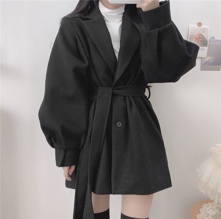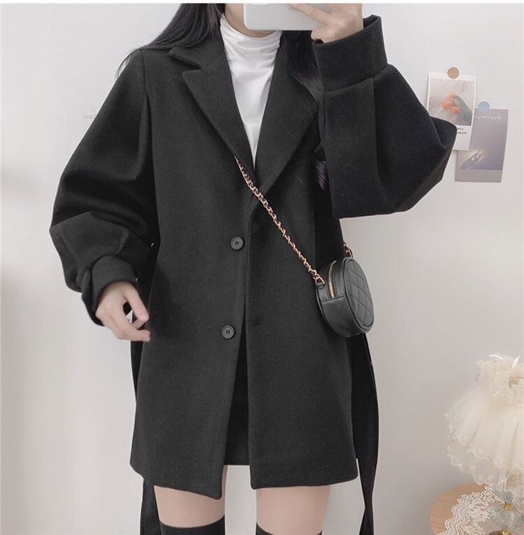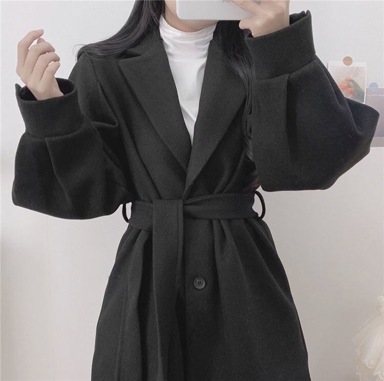 ウールロングコート 前ベルト調整式 秋冬向け厚手生地 婦人外套