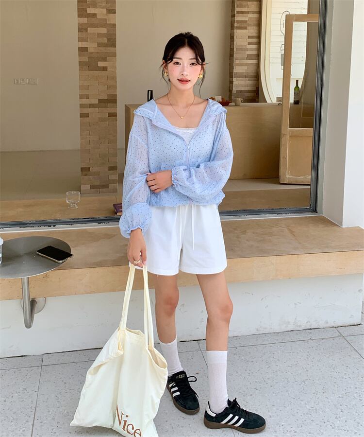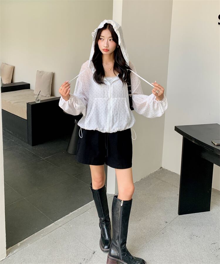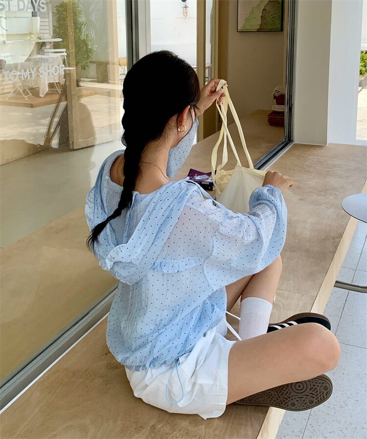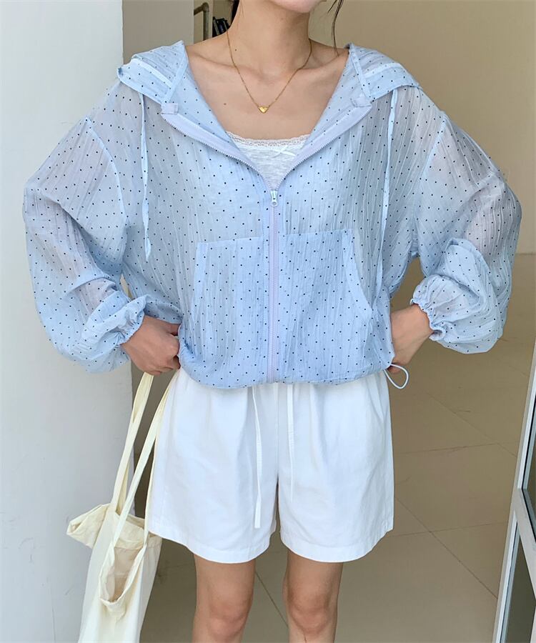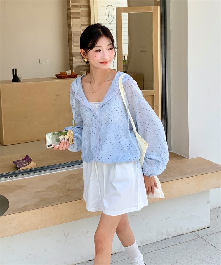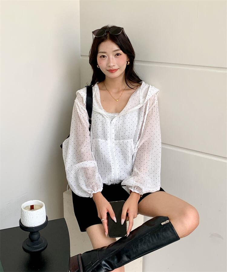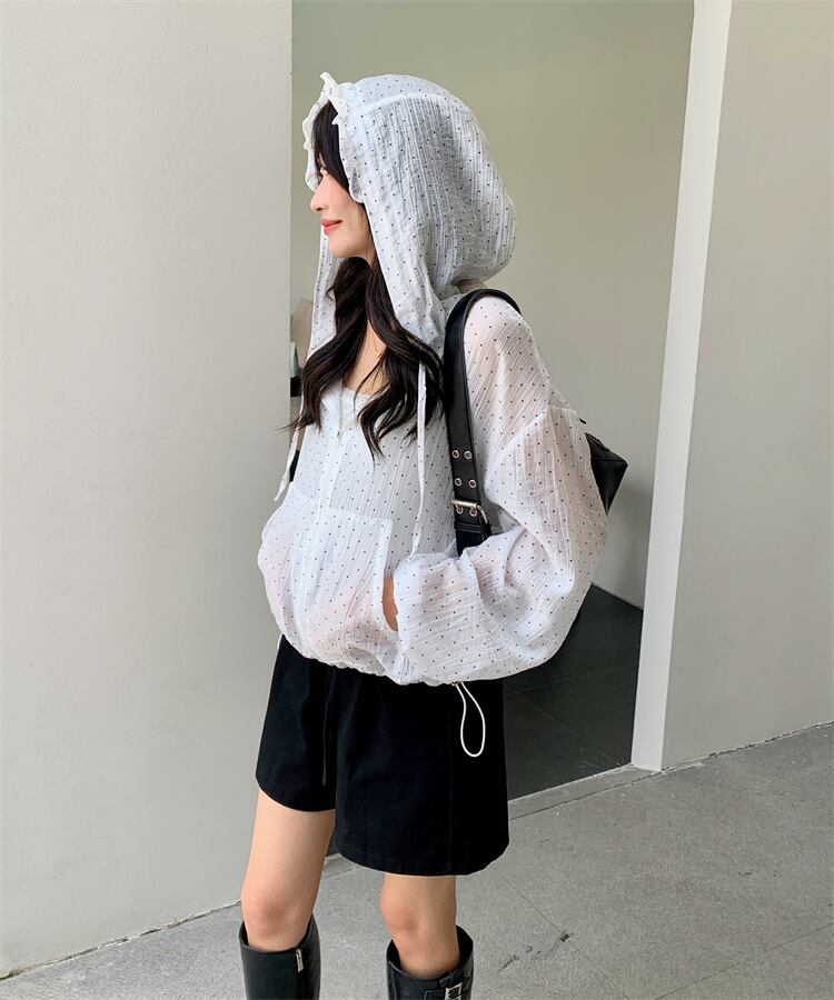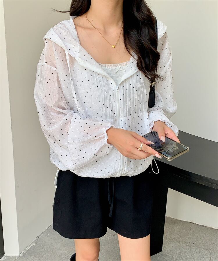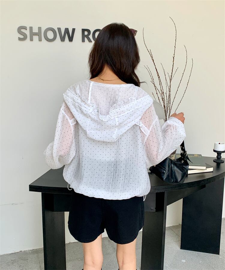 2025年秋向け 軽量UVカット 透け感トップス ドット模様 フリルデザイン フードあり