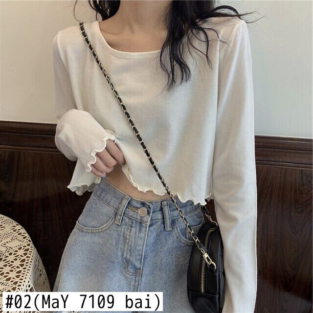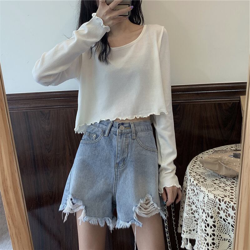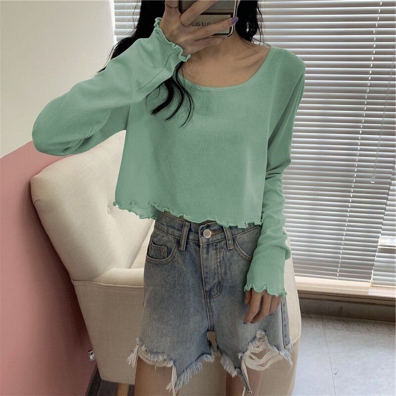 送料無料 ファッション韓国フリルクロップトップ春秋無地Tシャツ女性長袖スリムTシャツOネックショートトップス若い服 ロング スプリング 春物 オータム 秋物 ソリッドカラー AE33223283794394266