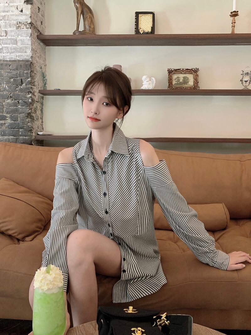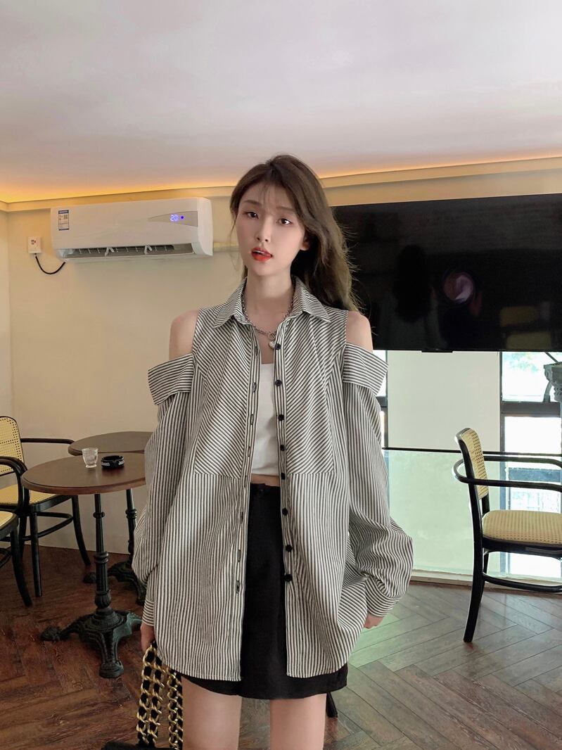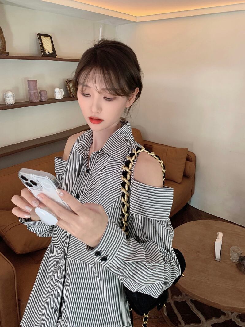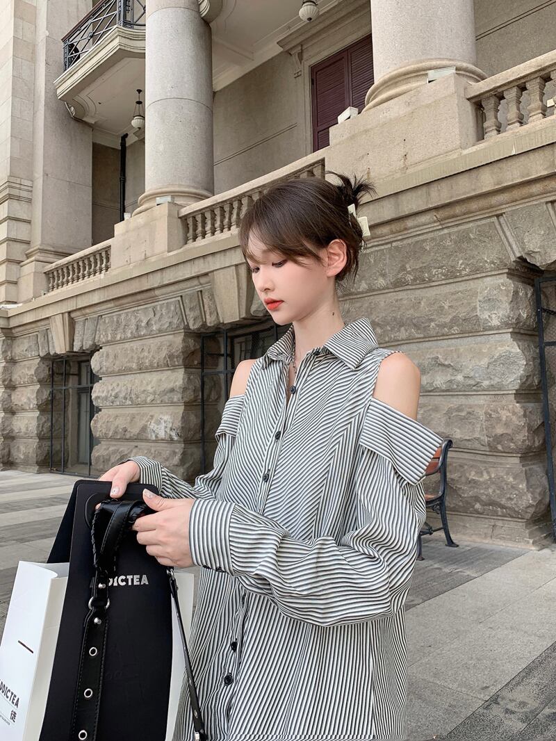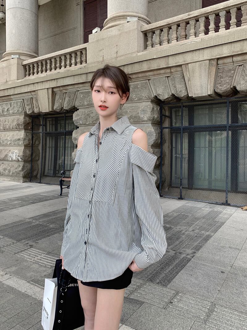 送料無料 2023 春秋の女性ストライプシャツカジュアルルーズレディーストップスとブラウス長袖ボタンアップダウン穴セクシーなブラウス ロング スプリング 春物 オータム 秋物 AE33223259688459737 | 女性の為の通販サイト-fashion navi