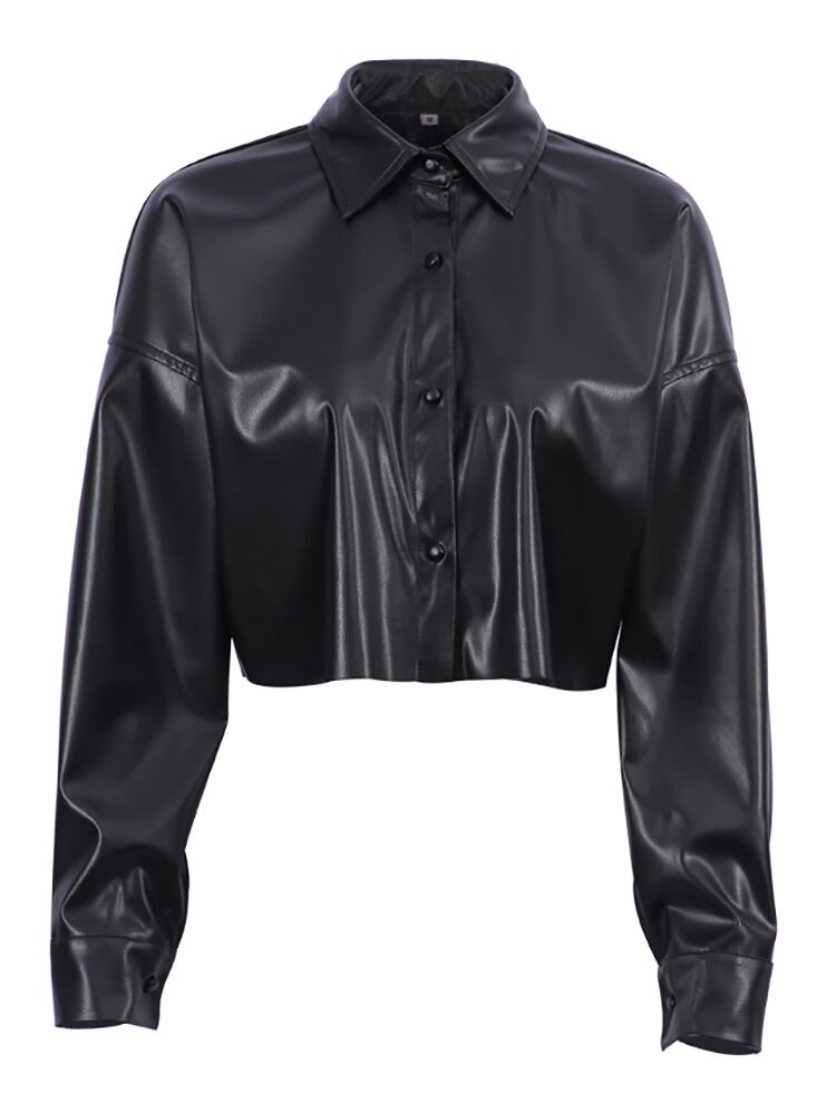 送料無料 ストリートフェイクレザー女性クロップドシャツ 2023 長袖 PU ラペルブラウスシングルブレストブラックトップス ロング ファー AE5567689875482310