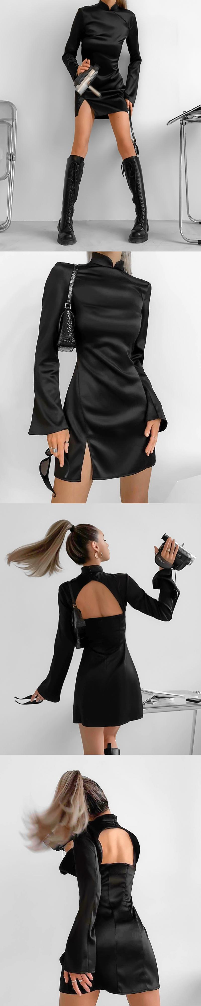 送料無料 フレア長袖黒バックレスドレス女性クラブスリットドレス春スタンドカラーイブニングミニスリムドレス 2023 ロング ブラック スプリング 春物 AE5567635322746734