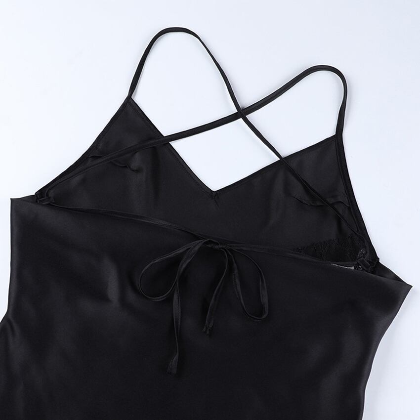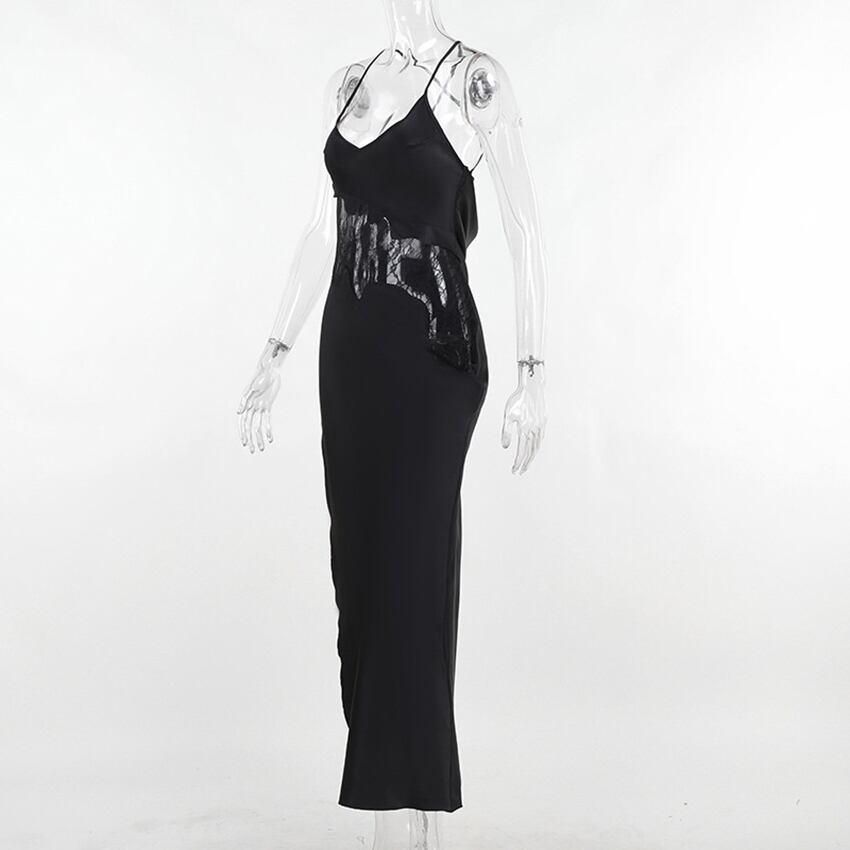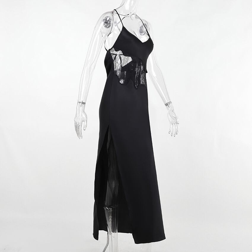 送料無料 セクシーな白いスパゲッティストラップドレス女性透明パッチワークレースドレス背中の開いたイブニングサテンスリットロングドレス 2023 ホワイト AE5567656043909428