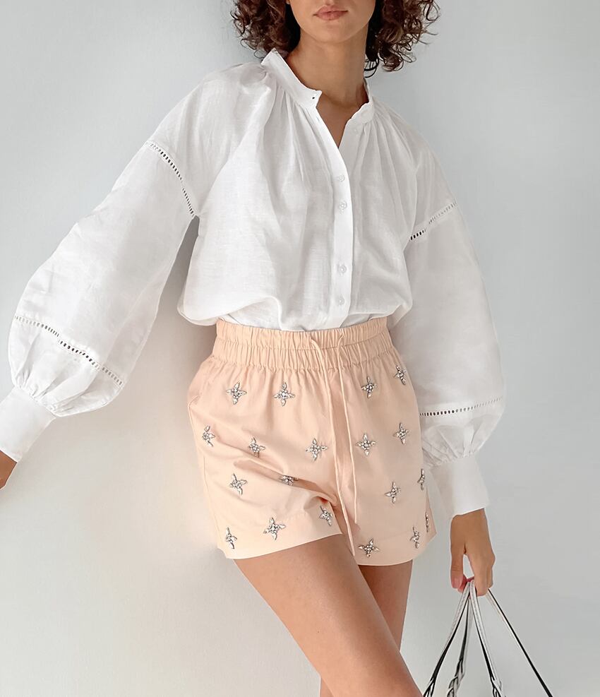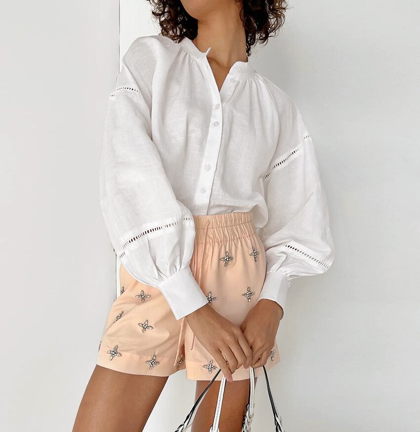 送料無料 オフィスホワイトコットンリネンシャツソフト女性パフスリーブルーズボタンブラウスとトップ春夏 2023 スプリング 春物 サマー 夏物 会社 学校 通勤や通学にも AE5567634429744723