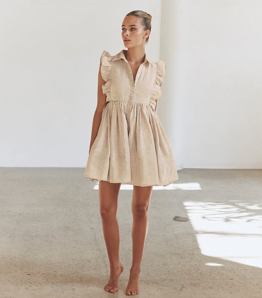送料無料 コットンリネンドレス フライングスリーブ シングルブレスト ルーズドレス 夏の女性 Aラインドレス シャーリング バケーションドレス サマー 夏物 AE5567690198951418