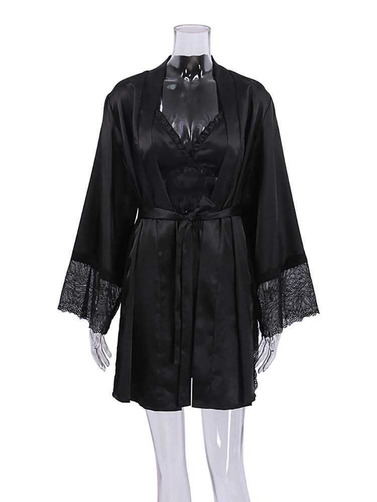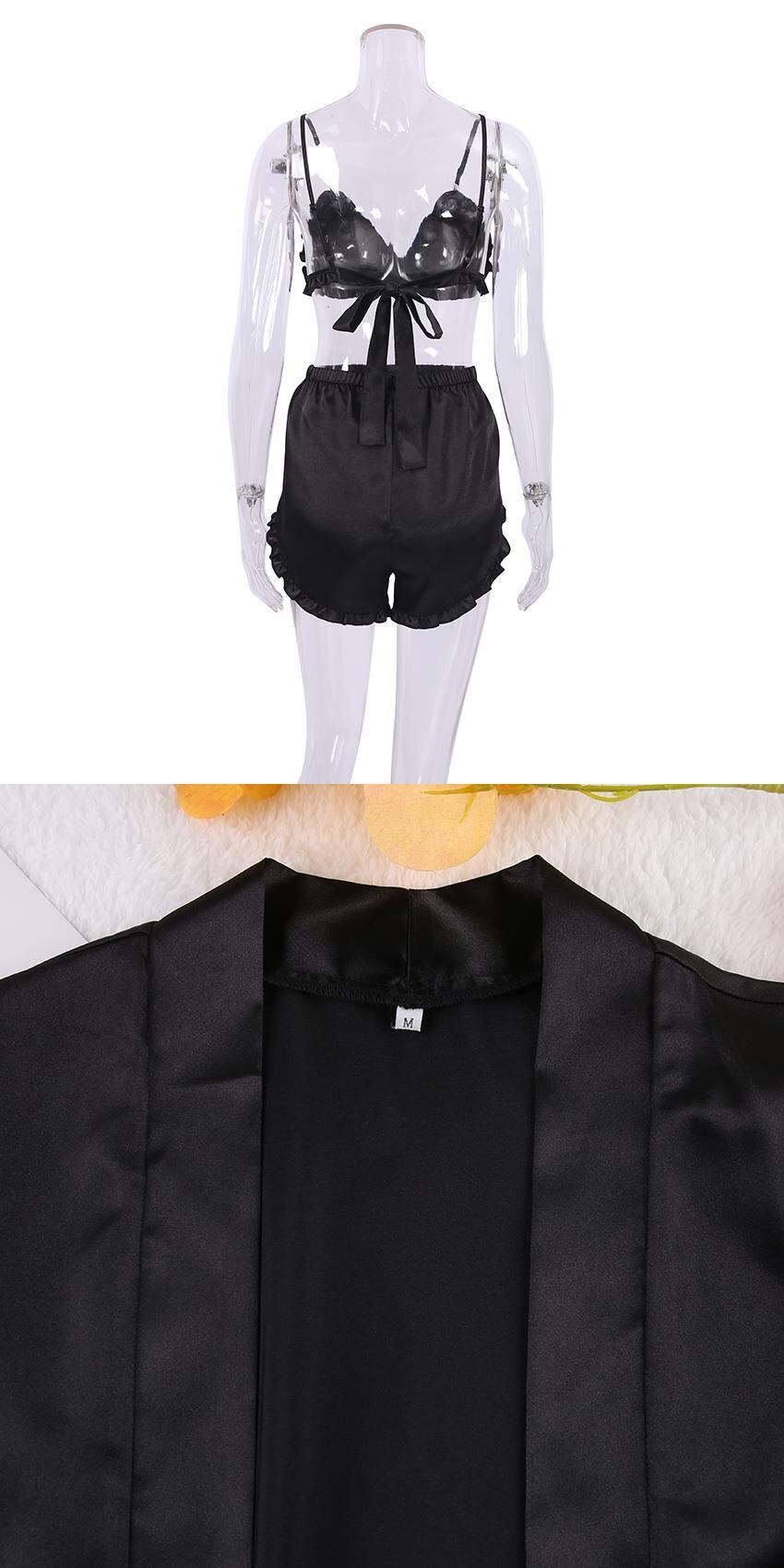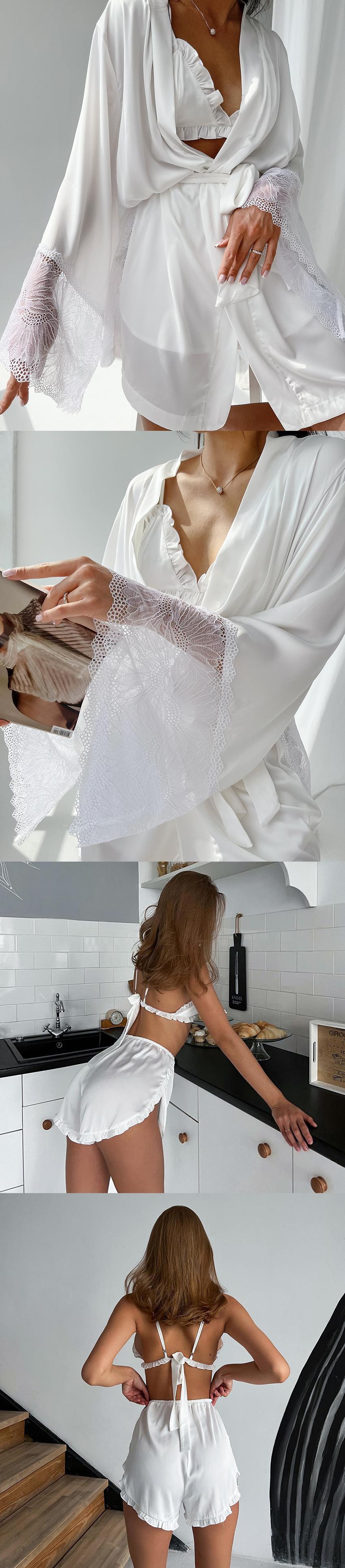 送料無料 パッチワークレースローブショーツセットとブラジャーサテンスーツ女性 3 個パジャマ衣装 2023 ナイトウェア ブルマー AE556765930542757