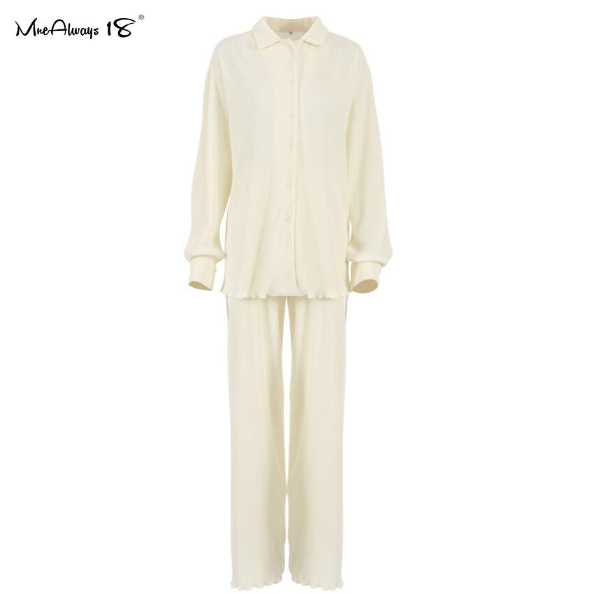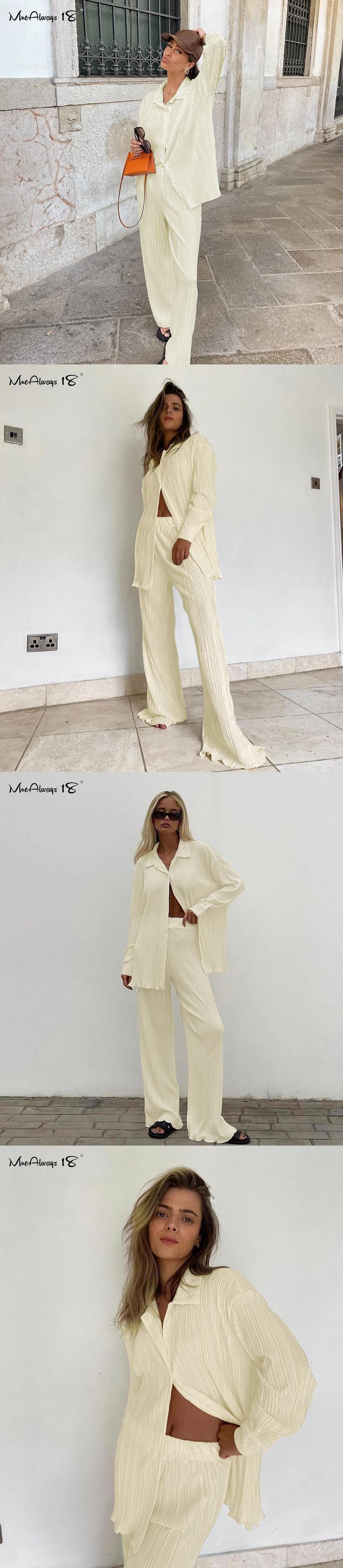 送料無料 2点セット女性オフィスプリーツ衣装ゆったり長袖シャツとパンツスーツ秋のワイドレッグパンツ ロング オータム 秋物 ワイドパンツ 会社 学校 通勤や通学にも AE5567686919724911