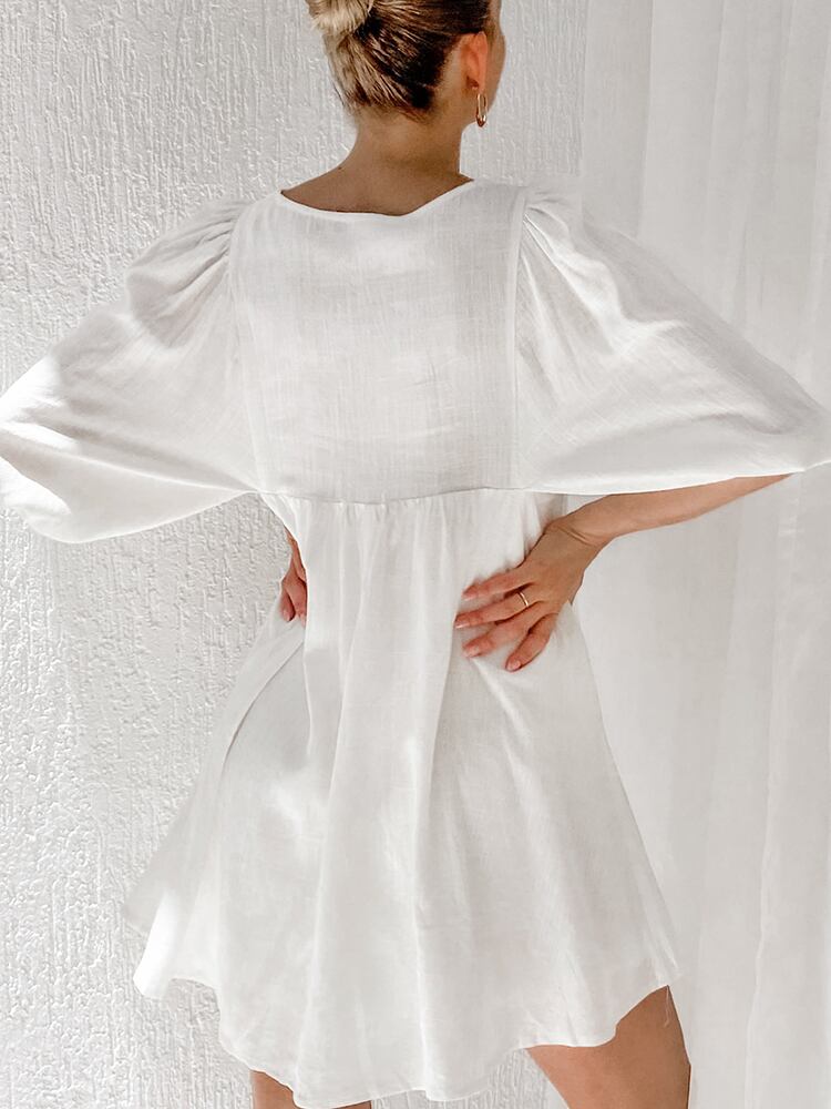 送料無料 Vネック ホワイトドレス サマーコットンリネン ルーズAラインドレス バケーションパフスリーブ ソフトレースアップ ショートドレス 2023 夏物 AE5567698105047109