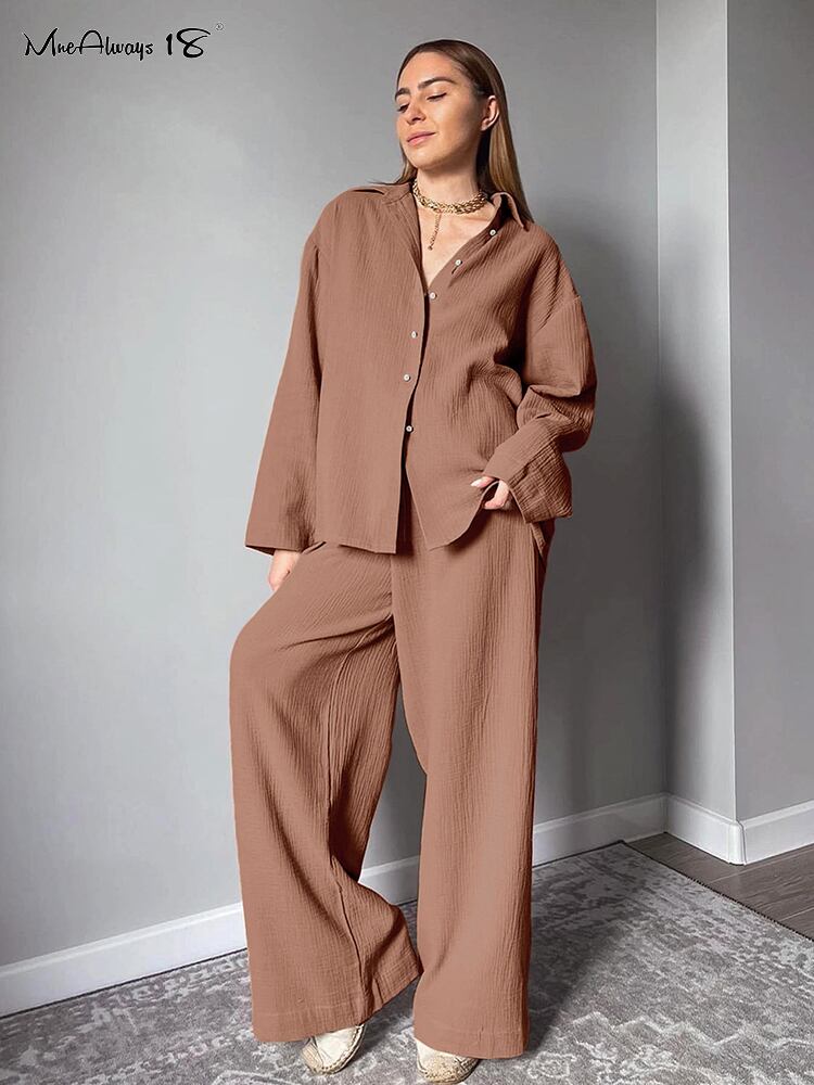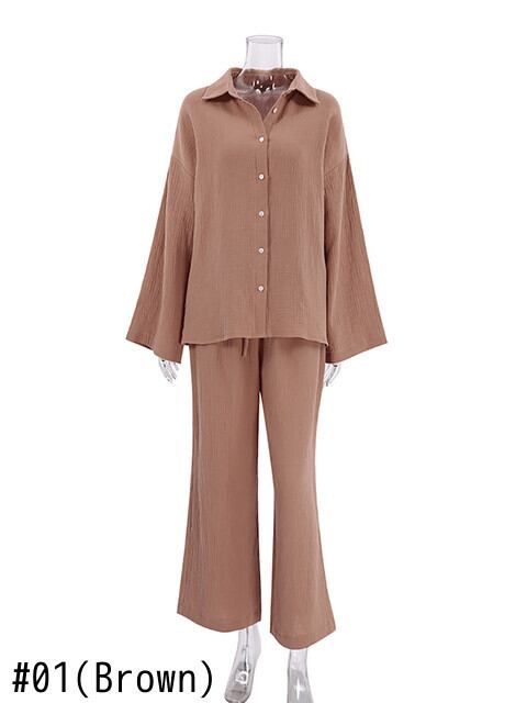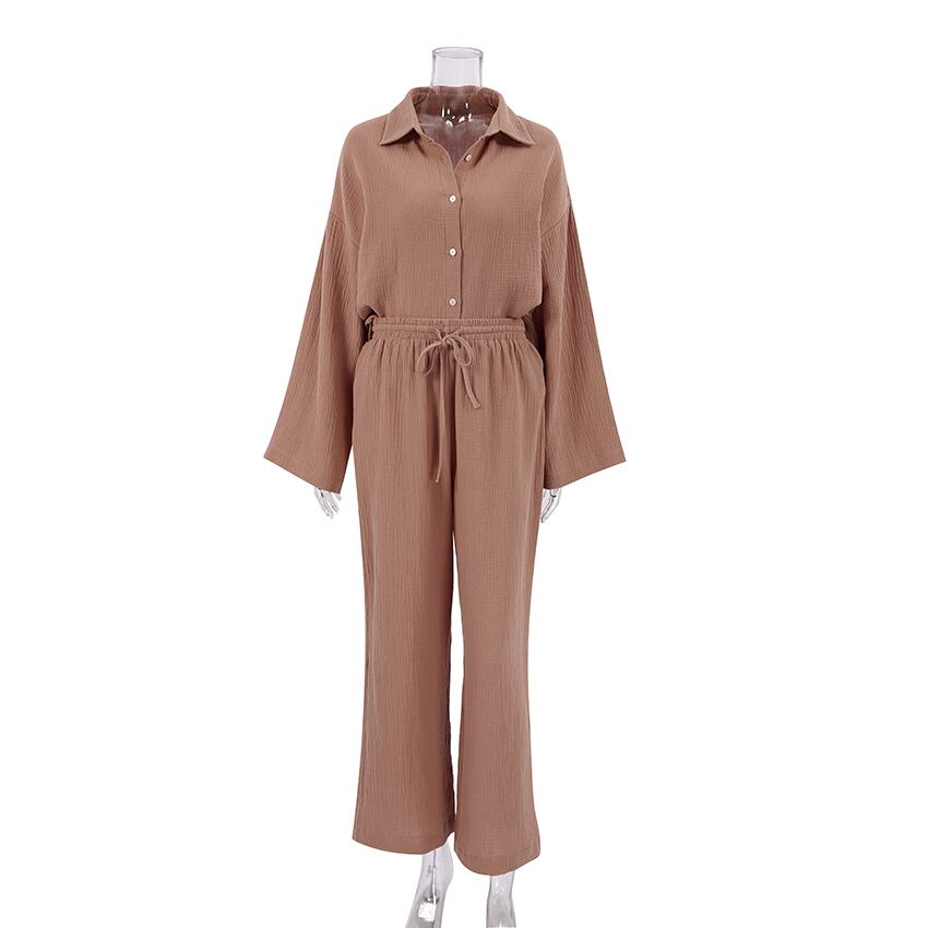 送料無料 巾着コットンレディースブラウンパンツスーツ無地パジャマ2点セット長袖シャツとパンツホームスーツ ロング ソリッドカラー AE5567686676145676