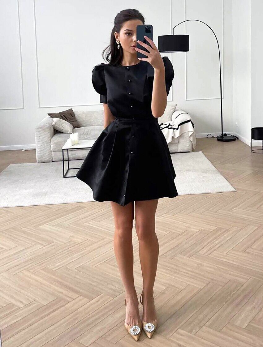 送料無料 黒人女性ボタンドレスレースアップパフスリーブシャーリングサマードレス 2023 オフィスミニドレスラウンドネック ブラック 夏物 Oネック 会社 学校 通勤や通学にも AE5567615096061203
