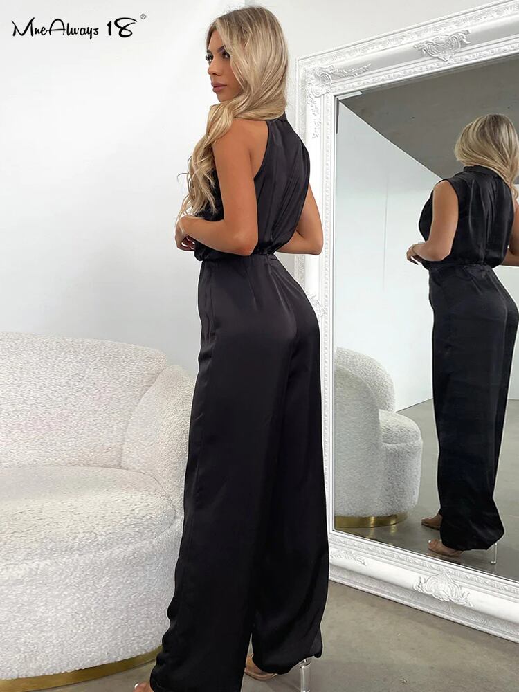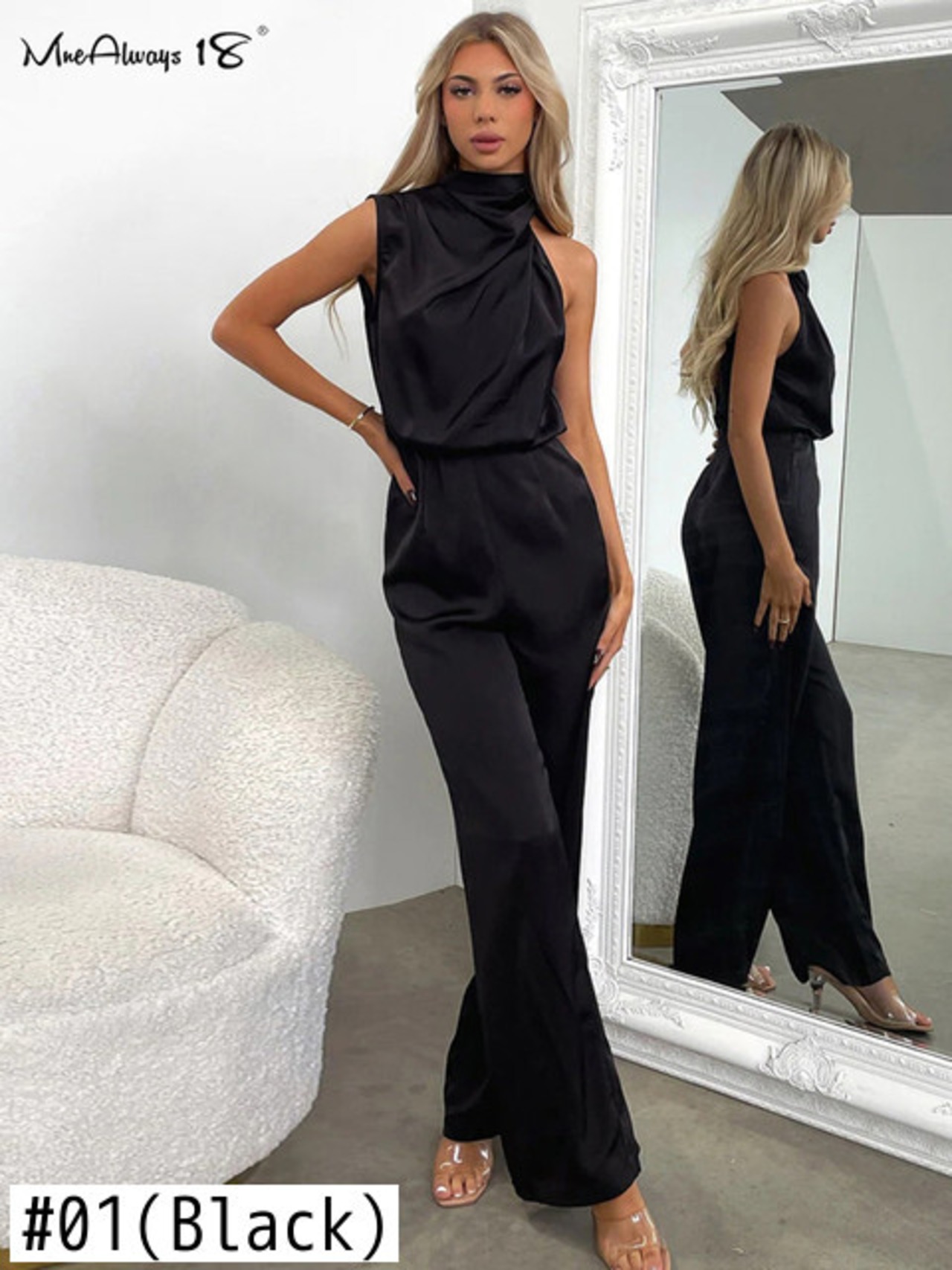 送料無料 黒不規則なオフィスロンパース女性 2023 年夏ノースリーブウエストジャンプスーツサテンシャーリングワンピース ブラック サマー 夏物 会社 学校 通勤や通学にも AE5567676115164658