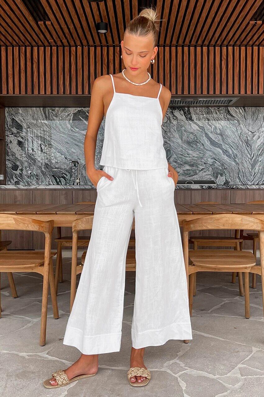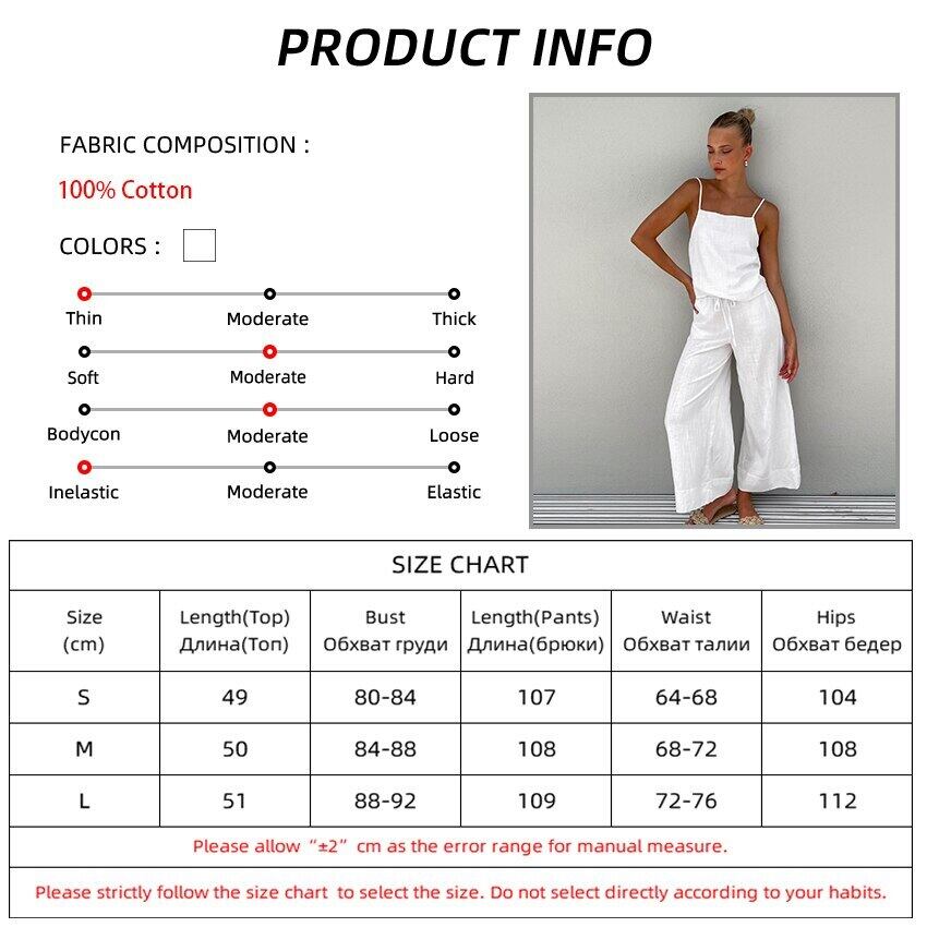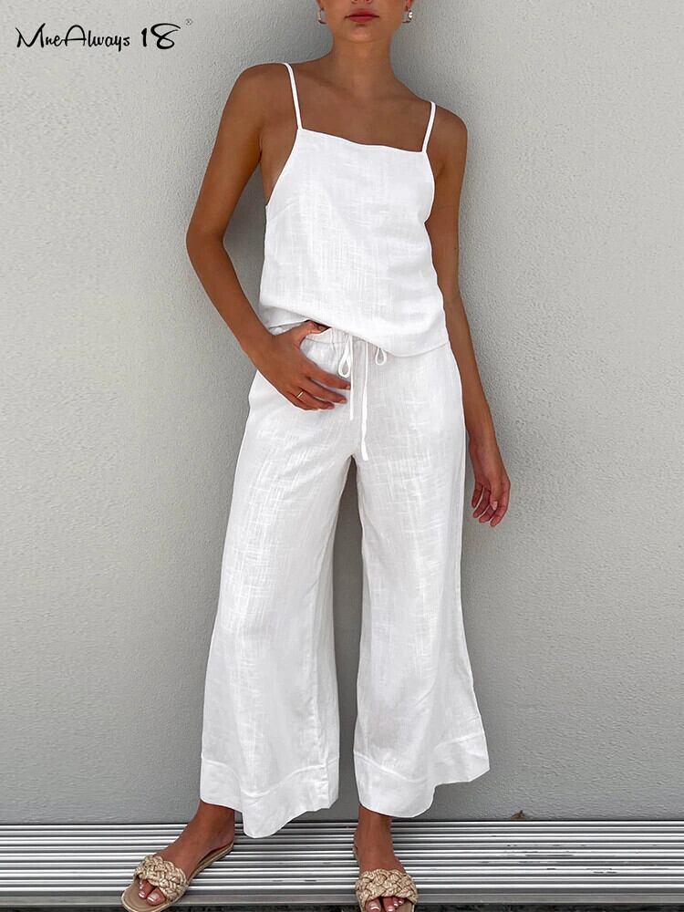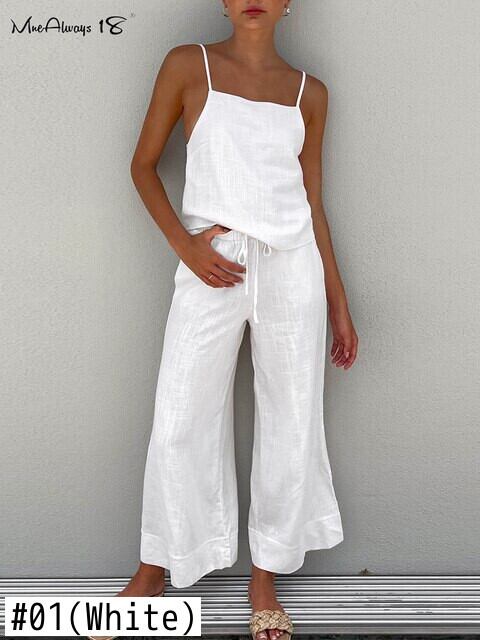 送料無料 ホワイト コットン リネン バケーション セット パンツ サマー スパゲッティ ストラップ トップとドローストリング ワイドレッグ パンツ 2 点セットのグループ 夏物 ワイドパンツ AE5567664057099065
