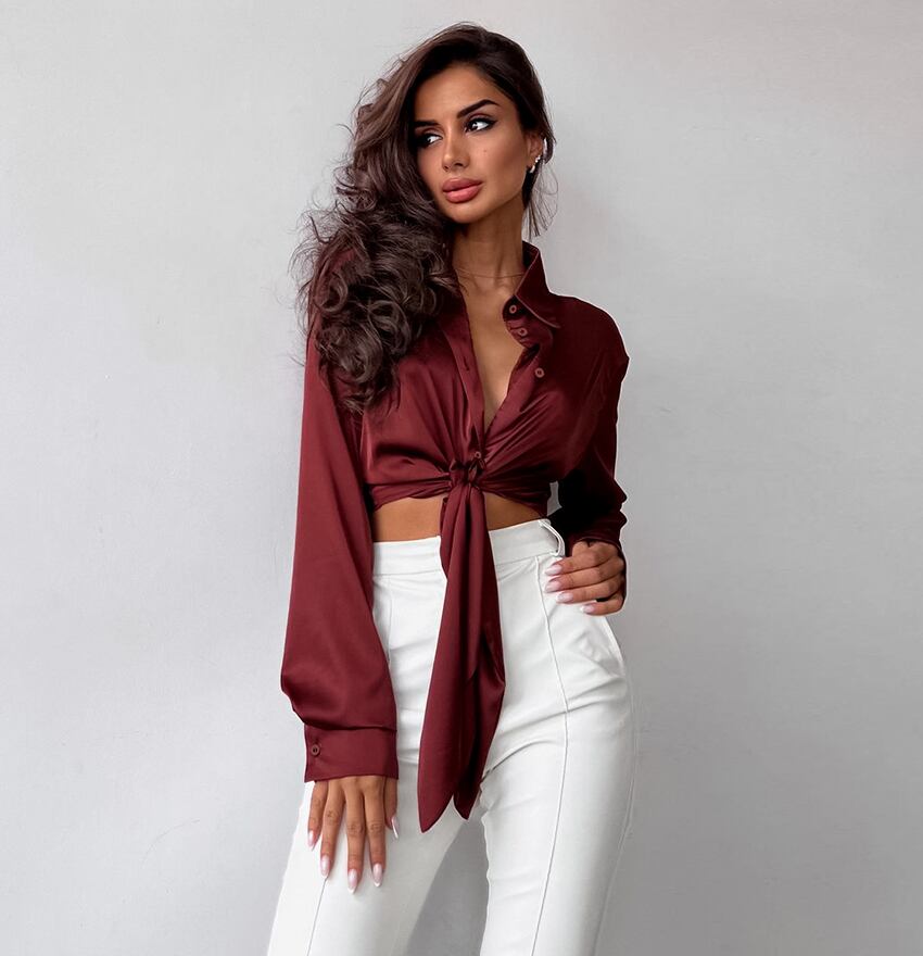 送料無料 セクシーな女性ヴィンテージブラウンパーティーシャツ春 2023 レースアップラペルブラウスとトップス長袖クラブクロップド ロング スプリング 春物 ビンテージ AE556765093407422