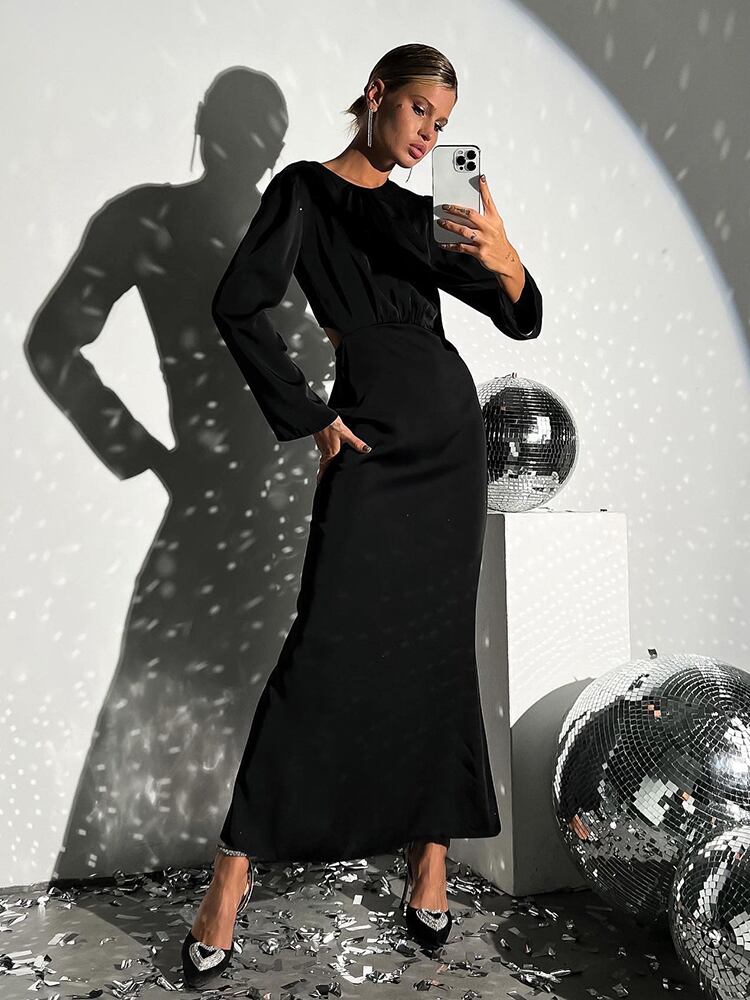 送料無料 サテン中空アウトイブニングドレスブルーレディース長袖スプリットマルドレス流れるシャーリンググリーンロングドレス夏 サマー 夏物 AE5567698158903222