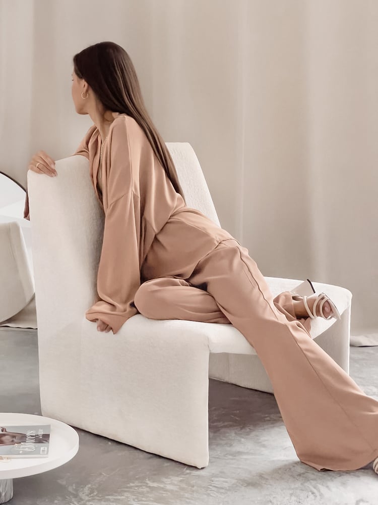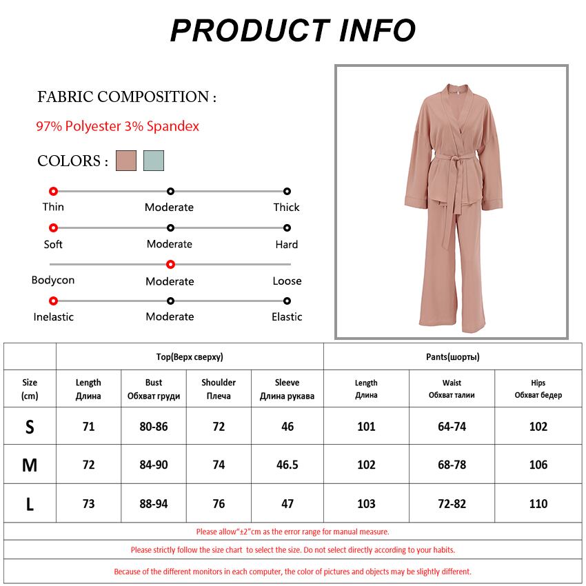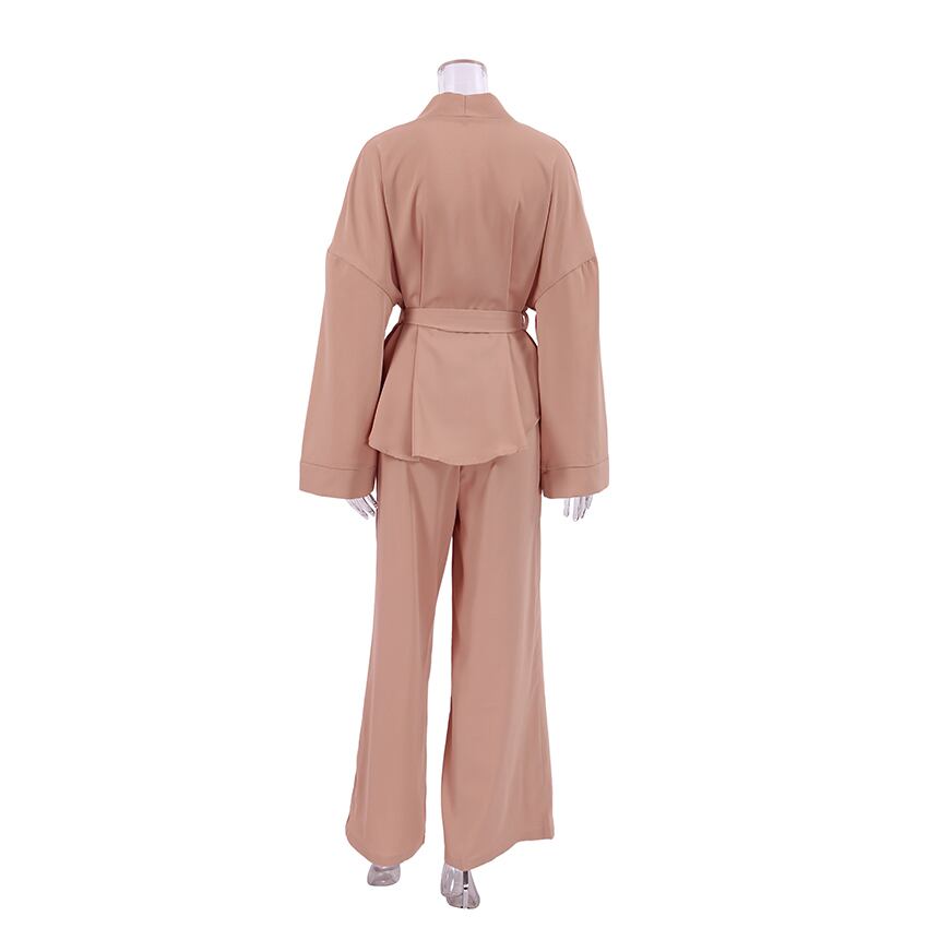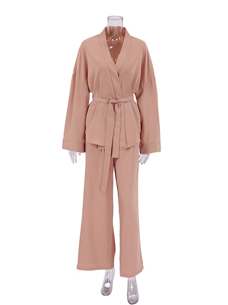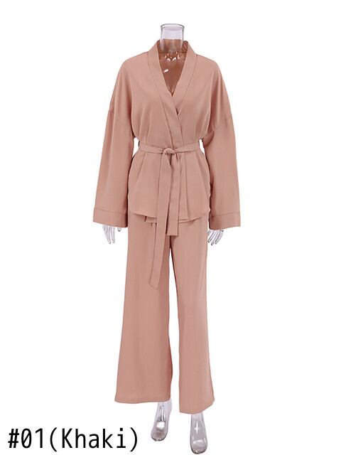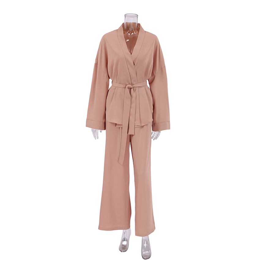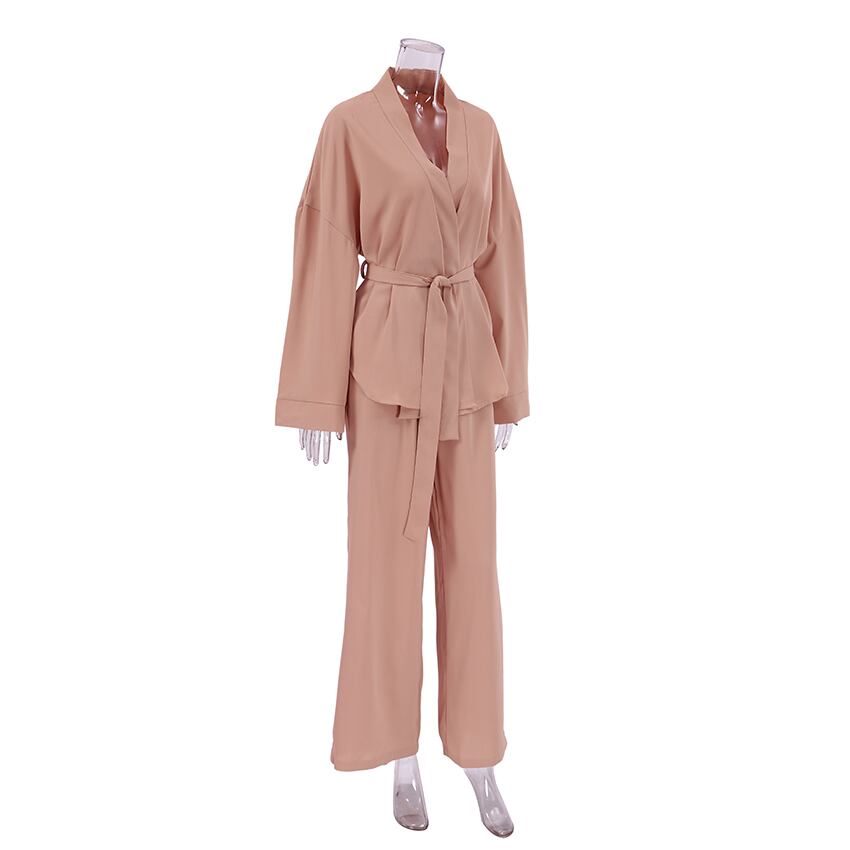 送料無料 ゆったり レディース 長袖シャツとパンツ 2点セット サッシ付き 無地 パンツスーツ 寝間着セット ロング ソリッドカラー AE5567662276937550