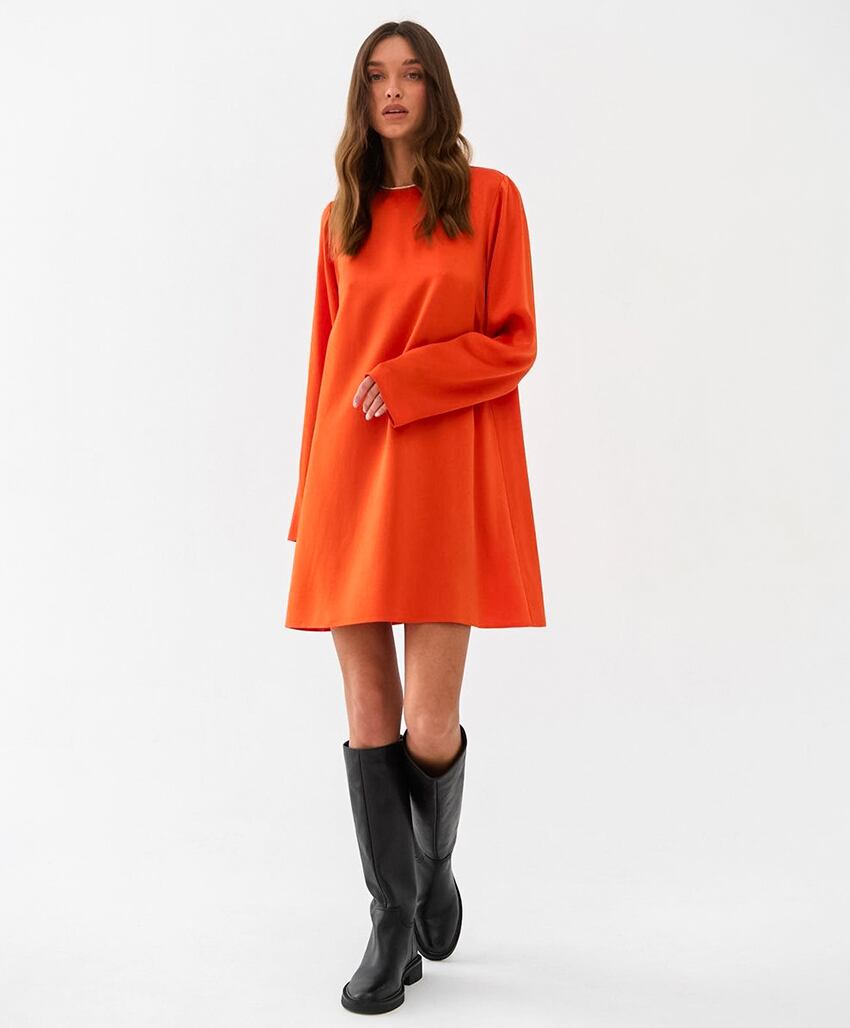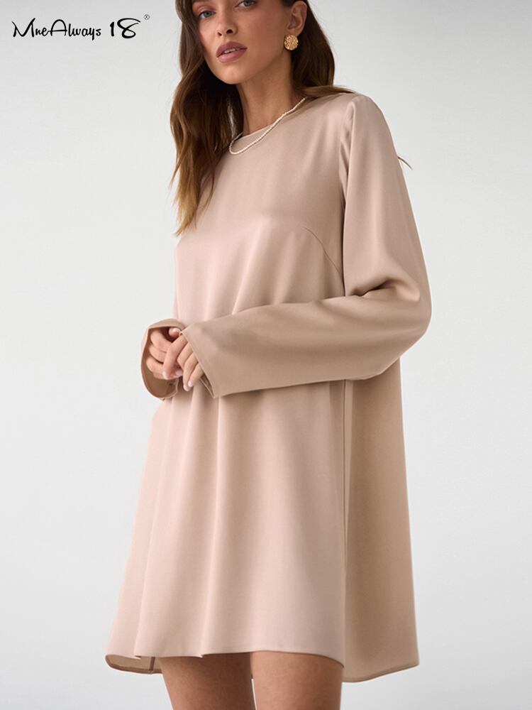 送料無料 サテン レディース Aラインドレス ドレープ 長袖 オフィス ミニドレス Oネック オレンジ Clyドレス 春夏 ロング スプリング 春物 サマー 夏物 会社 学校 通勤や通学にも AE556762447820855