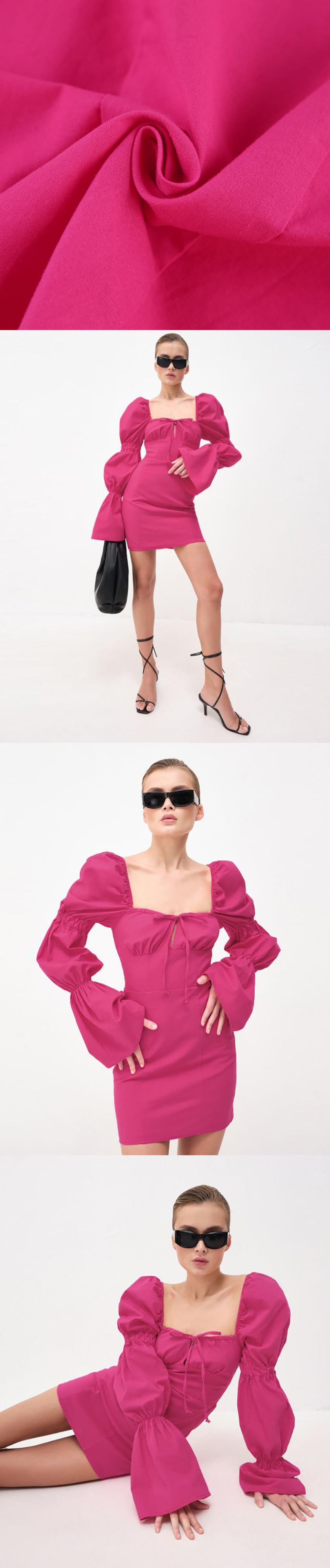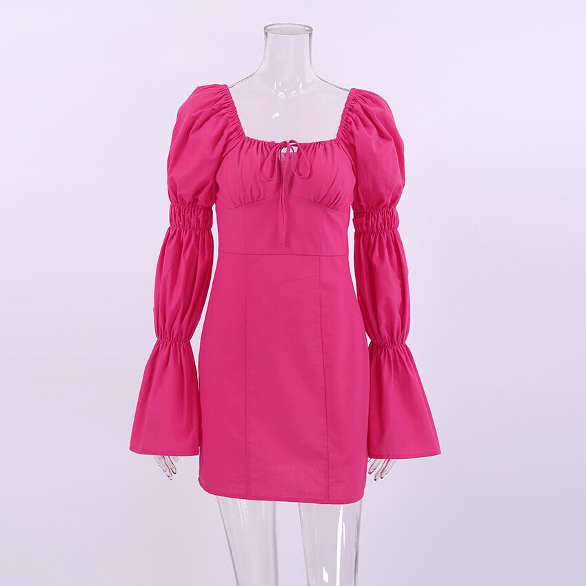 送料無料 シックなフレアスリーブコットンリネンドレスセクシーな女性パーティーちょう結びピンクドレススクエアカラーペンシルドレスクラブ リボン スクウェア AE5567662989928520