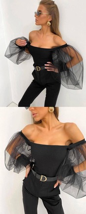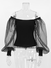 送料無料 ニットパッチワークセクシーな女性ブラウスとメッシュオフショルダーブラックトップススリムストリートプルオーバー Tシャツ AE5567674571068999