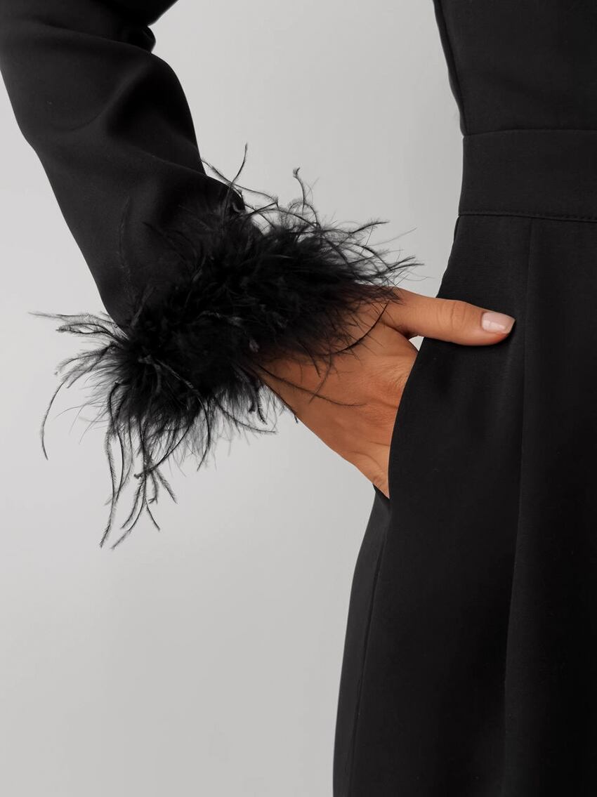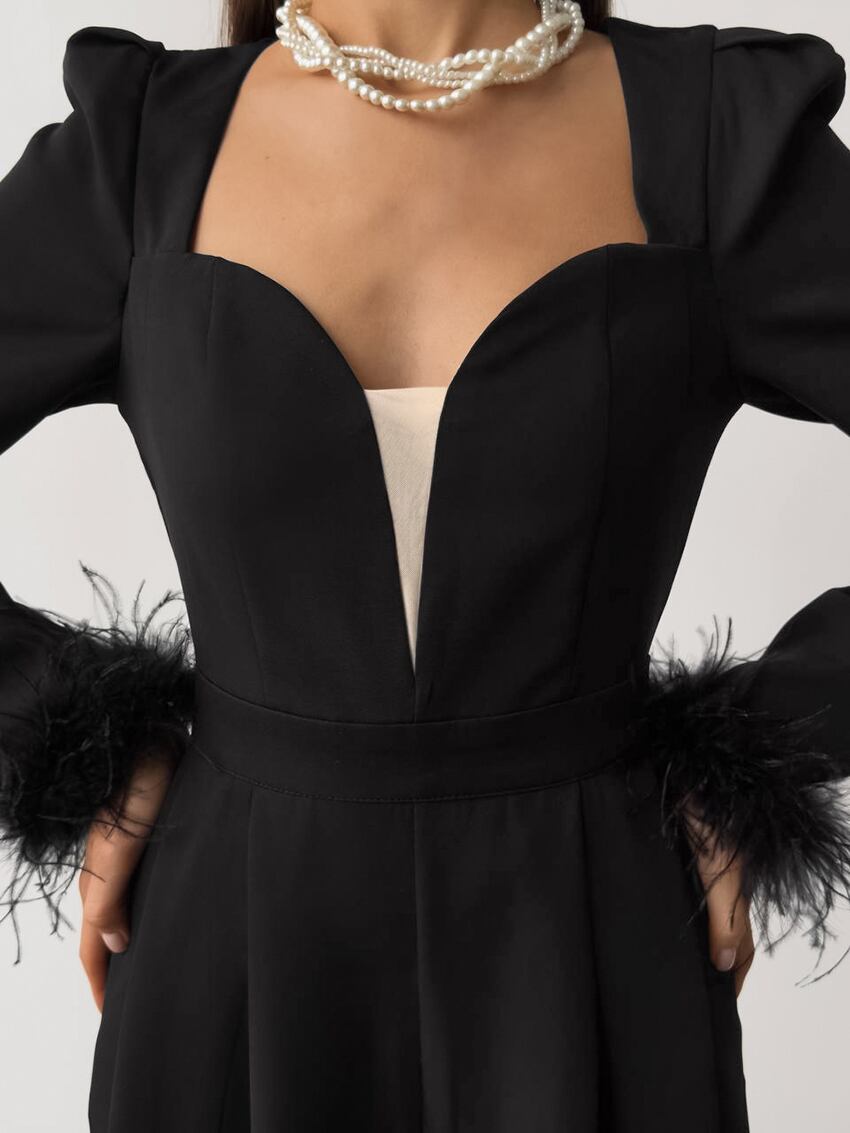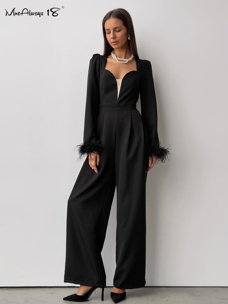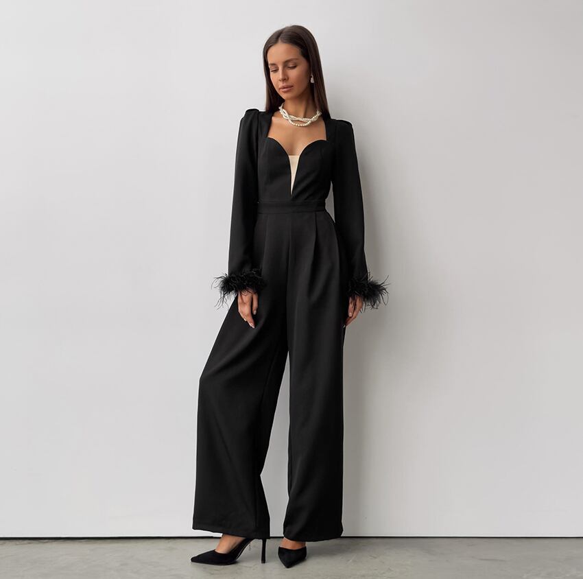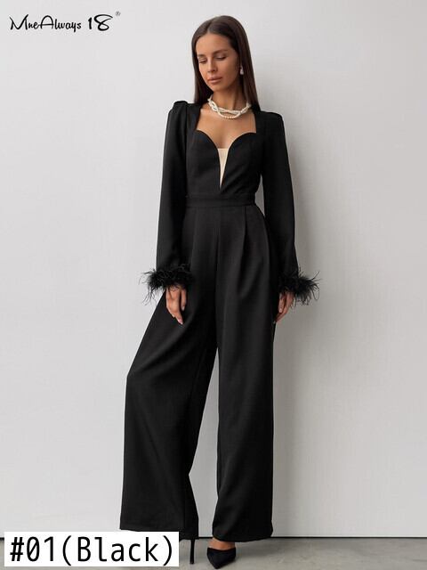 送料無料 フェザー カフス オフィス ロンパース ブラック Vネック ワイドレッグ ジャンプスーツ プリーツ 2023年春 長袖 ワンピース ロング スプリング 春物 ワイドパンツ 会社 学校 通勤や通学にも AE556764800744693
