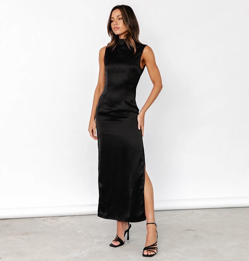 送料無料 ドレープ Cly イブニング ロング タンク ドレス レディース ブラック サテン マル スプリット ドレス ノースリーブ マキシレングス ボディコン ドレス AE5567641098990495