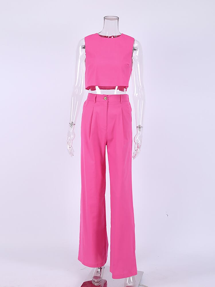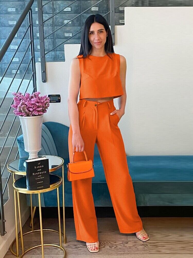 送料無料 オフィス 2 ピース女性セットクロップドベストとプリーツワイドレッグパンツ衣装ジップ夏 2022 グリーンスーツ サマー 夏物 ワイドパンツ 会社 学校 通勤や通学にも AE5567678389167830