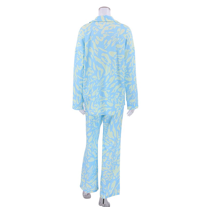 送料無料 プリント 2 点セット ポケット付き レディース シングルブレスト ラペル トップスとパンツ ブルー ホームスーツ スリープツーピーススーツ AE556765396624899