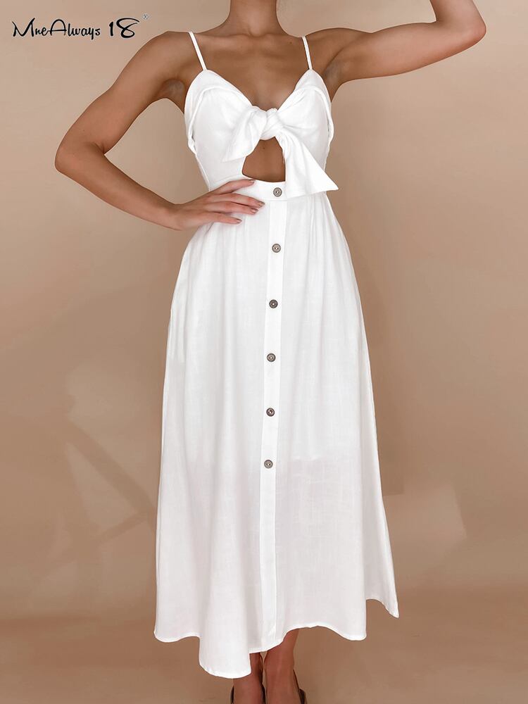 送料無料 ホワイトセクシーなちょう結び中空アウト自由奔放に生きるドレス夏 2023 スパゲッティストラップ流れるドレス女性ミディドレス V ネック リボン サマー 夏物 Vネック AE5567610589926642
