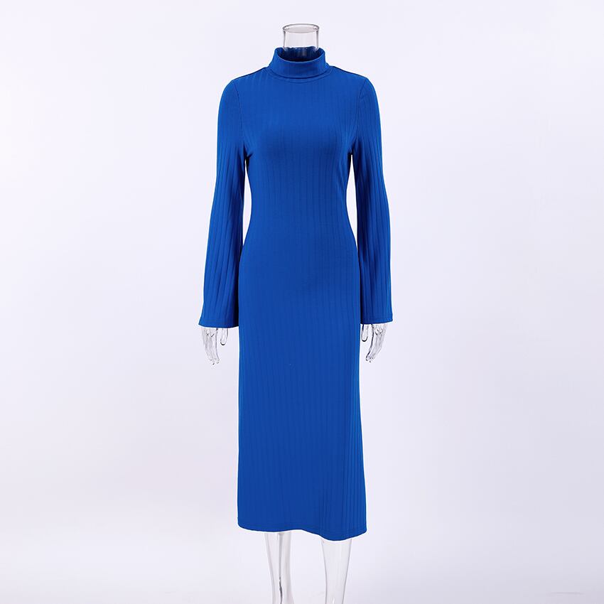 送料無料 タートルネック ボディコン ニットワンピース 長袖 リブ ミディワンピース ブルー 秋冬 オフィス ロング ニットワンピース オータム 秋物 ウィンター 冬物 会社 学校 通勤や通学にも AE5567697431934823