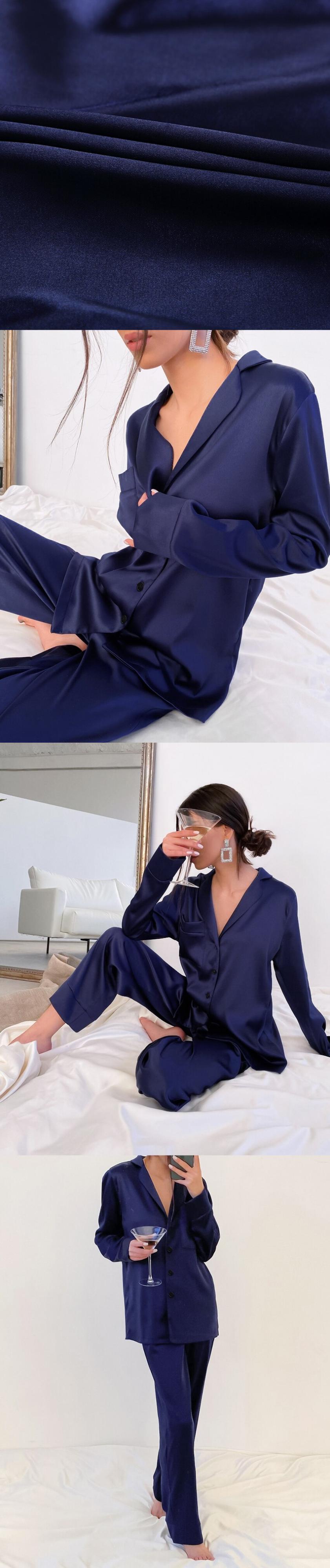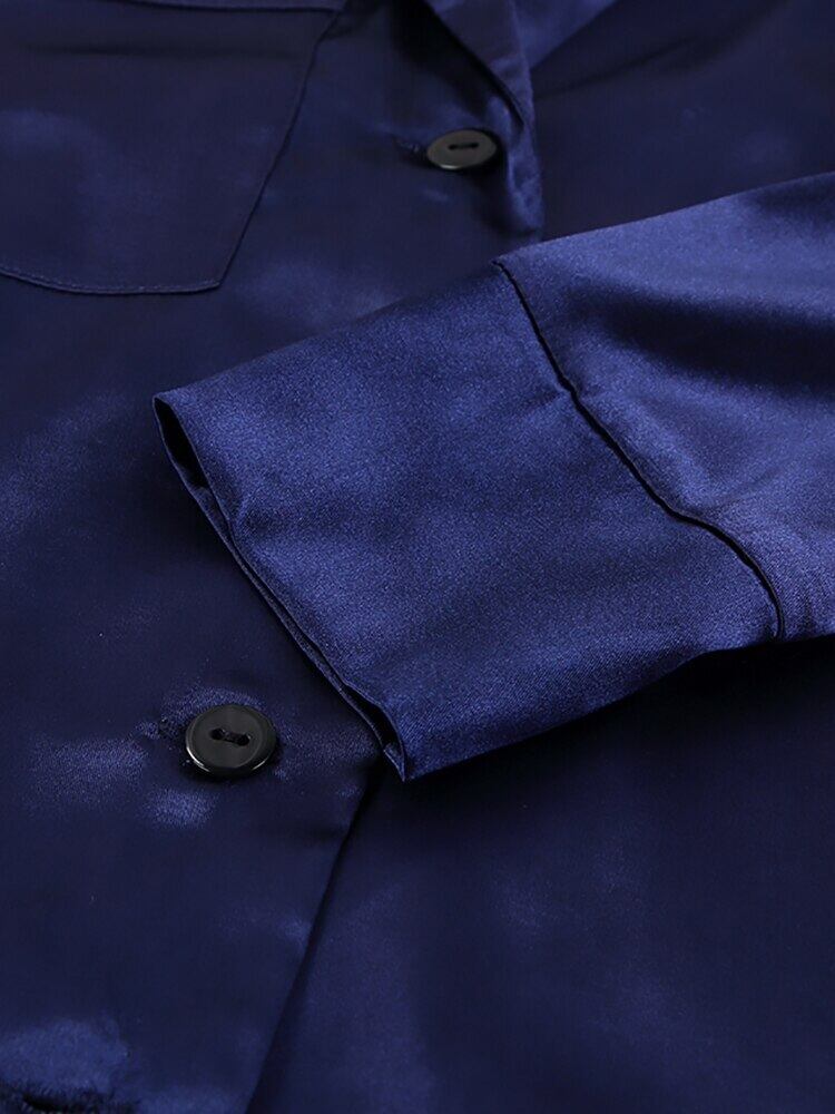 送料無料 サテン レディース 2点セット ポケット 長袖 ダークブルー ボタン シャツとパンツ スリープスーツ 無地 ホームセット ロング ソリッドカラー AE5567698820823658