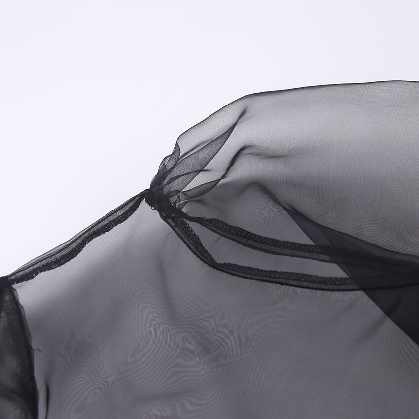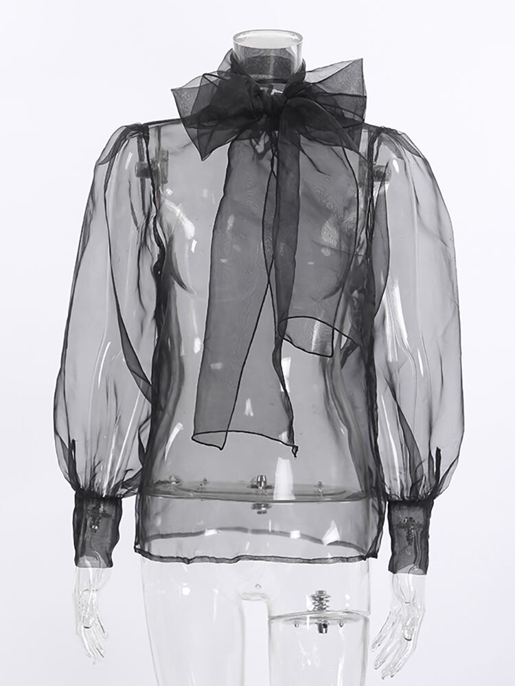 送料無料 セクシーな女性メッシュ透明シフォンブラウス女性長袖ちょう結び黒シャツ春夏 2023 レースアップトップス ロング ブラック リボン スプリング 春物 サマー 夏物 AE556761863205371