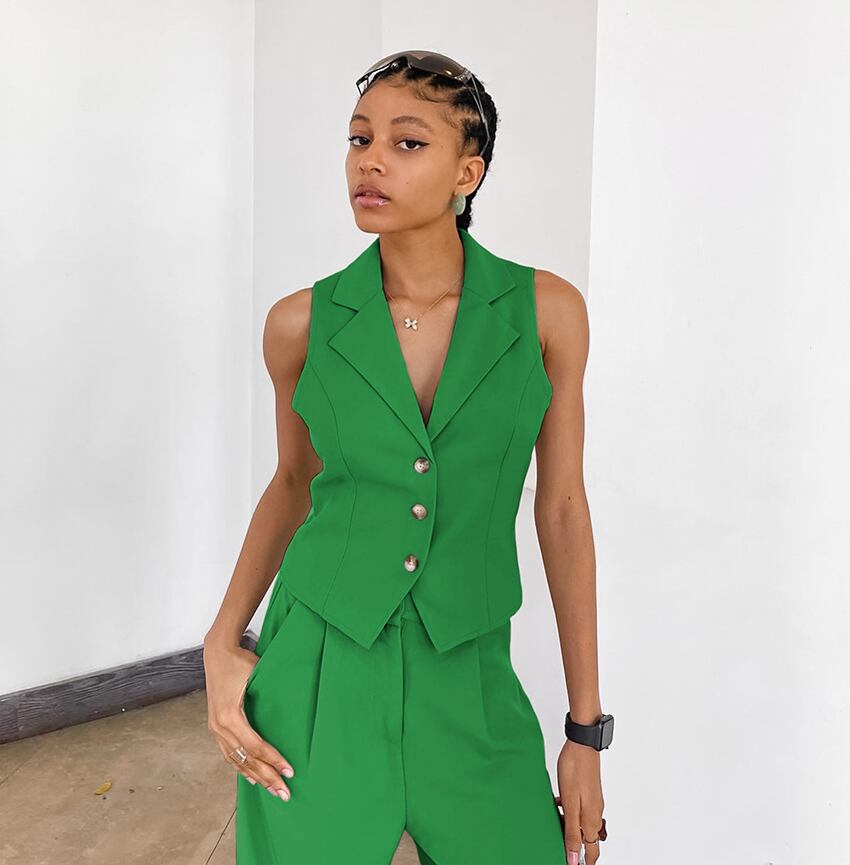 送料無料 グレー オフィス 2 点セット女性衣装ブレザー ベストとワイドレッグ パンツ セット夏 2023 ワーク グリーン スーツ サマー 夏物 ワイドパンツ 会社 学校 通勤や通学にも AE5567618404000515