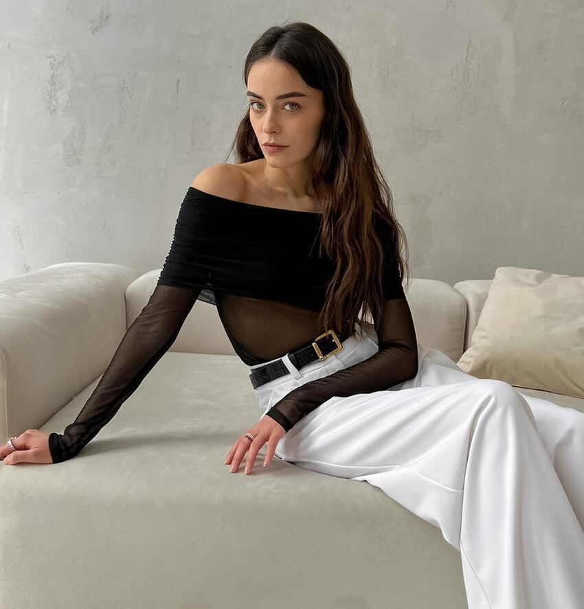 送料無料 黒のセクシーなスラッシュネックニットメッシュ Tシャツ春 2023 長袖トップスシャーリング弾性オフィス Tシャツ夏 ロング ブラック エラスティック 伸縮 スプリング 春物 サマー 夏物 会社 学校 通勤や通学にも AE5567643296891143