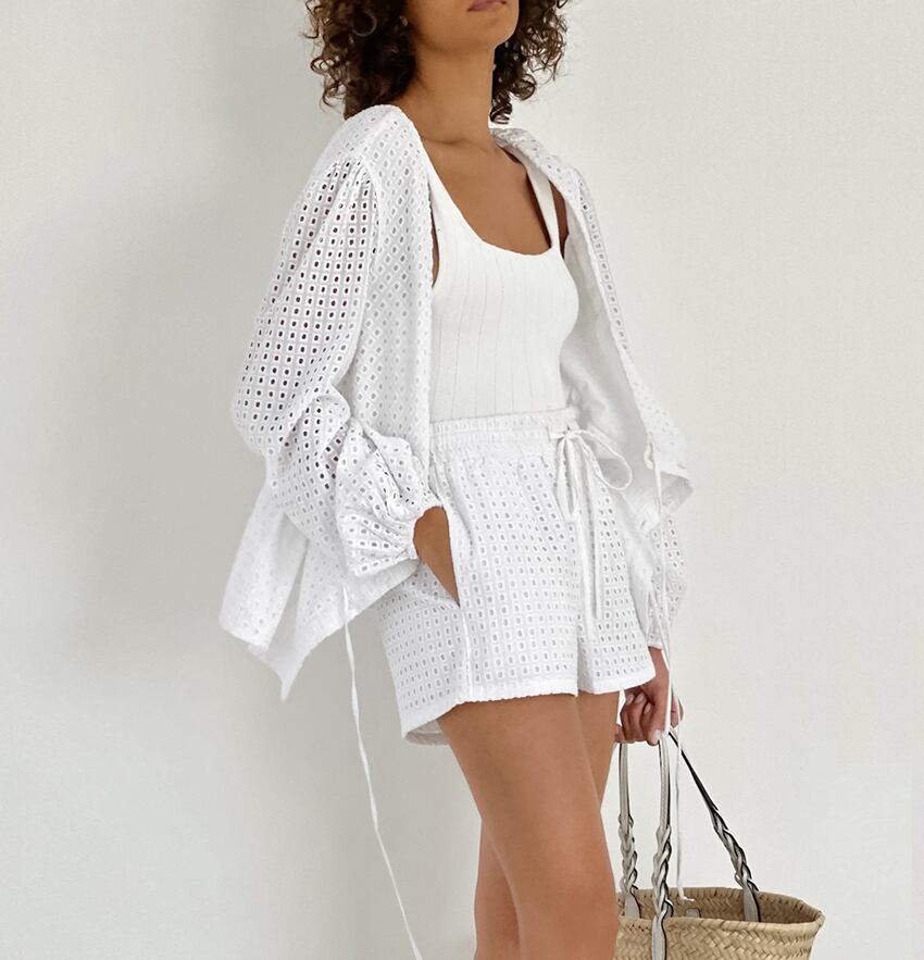 送料無料 ホワイト ジャカード シック ショーツ スーツ ツーピース バケーション アウトフィット ブレス シャツとワイドレッグ ショーツ セット レディース 2023 ブルマー ワイドパンツ AE5567694323518518