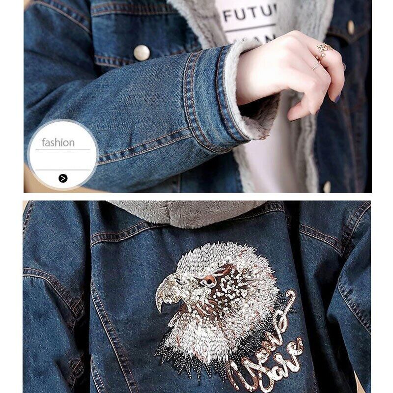 送料無料 冬の厚いフード付きデニムジャケット女性スパンコールジーンズジャケット緩いプラスサイズ暖かいコートフリース綿生き抜く コットン 大きめサイズ ウィンター 冬物 AE3356579116289003