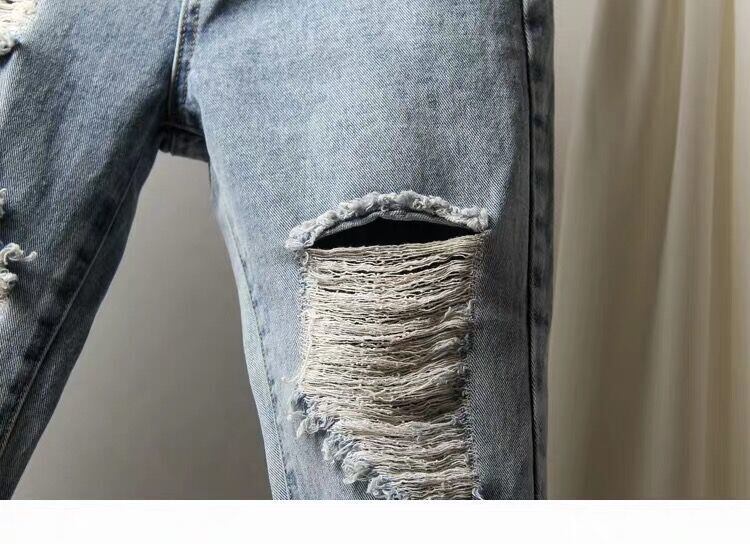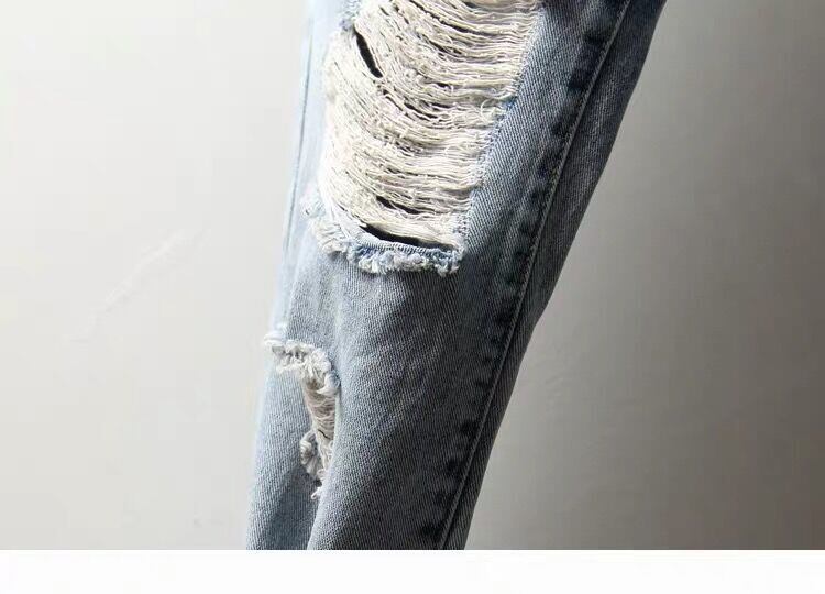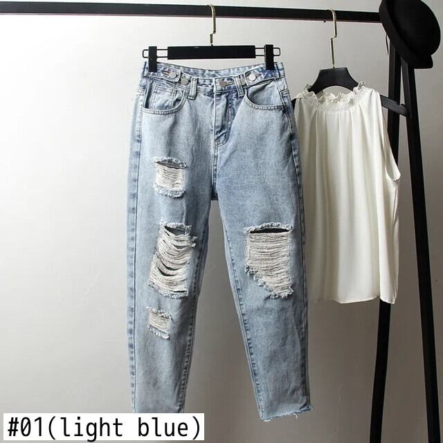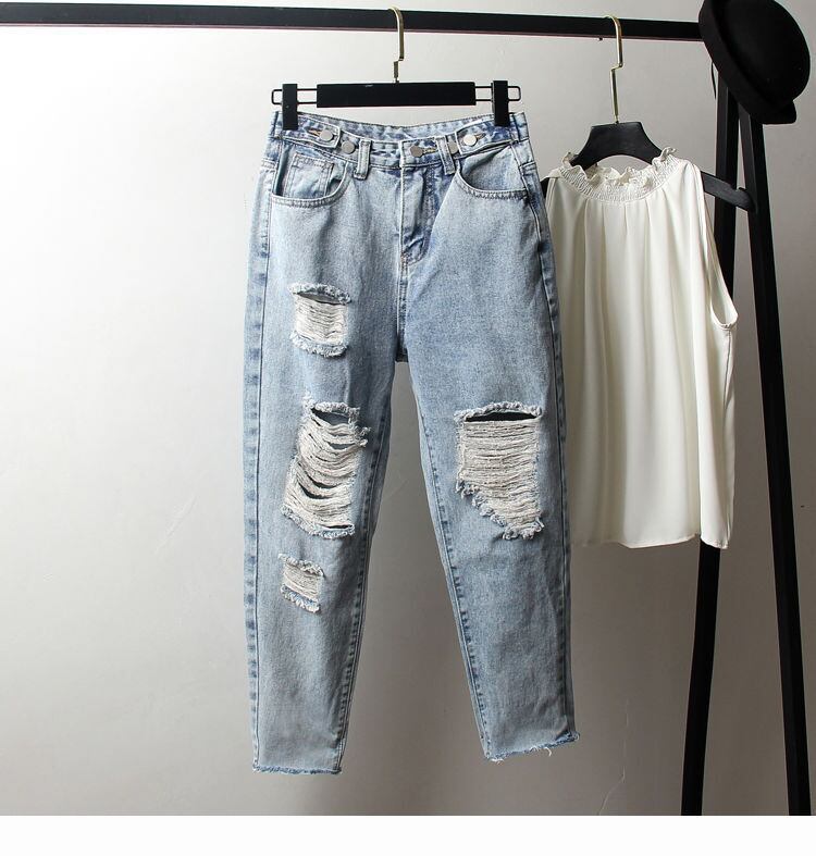 送料無料 ストリートライトブルーリッピングジーンズ女性流行の弾性ボタンウエストデニムパンツボーイフレンドハーレム Pantalones デ Mezclilla エラスティック 伸縮 AE3356535235630833