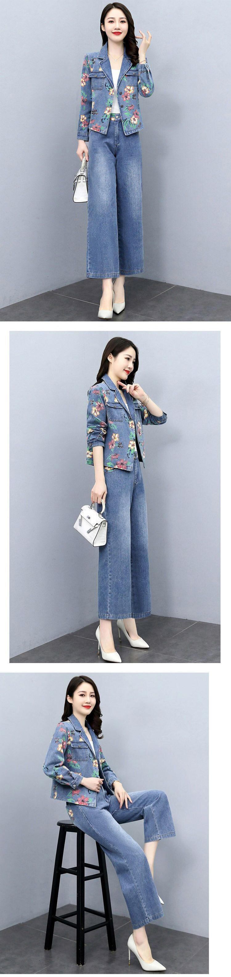 送料無料 デニムブレザーツーピースセット女性プリント春ジャケット特大 4xl 衣装ウエストワイドレッグジーンズスーツオフィスワーク スプリング 春物 ワイドパンツ 会社 学校 通勤や通学にも AE3356596290911654
