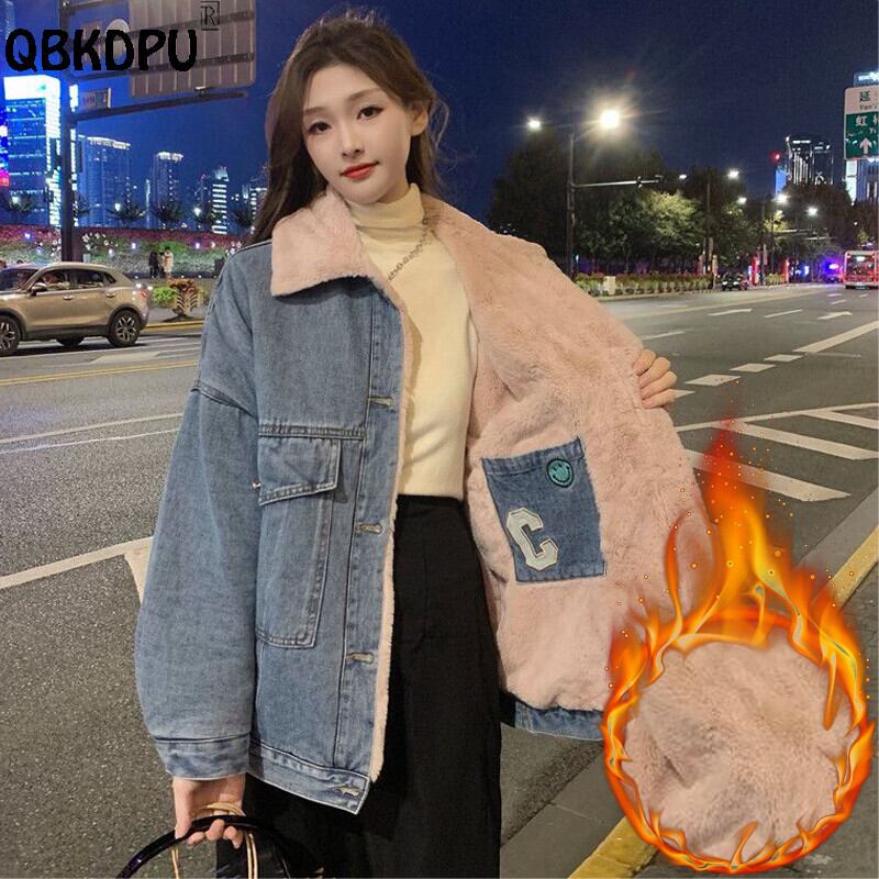 送料無料 冬の可逆フリースライナージーンズジャケット女性緩い厚みのデニムコートシングルブレスト暖かい冬のチャケタス ウィンター 冬物 AE3356580186455368