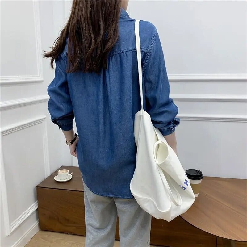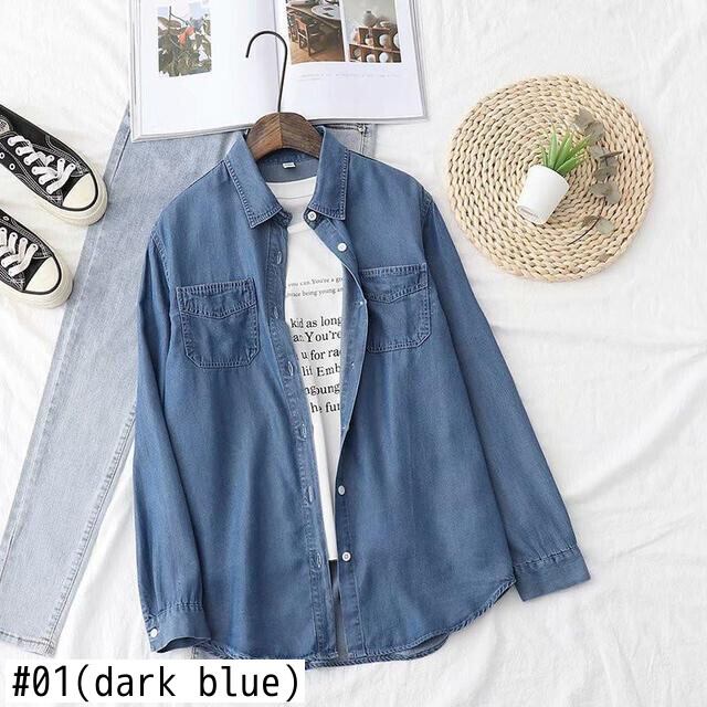 送料無料 2022 春夏薄型シャツ女性緩い軽量プラスサイズのデニムブラウス固体ボタン長袖トップ ロング 大きめサイズ スプリング 春物 サマー 夏物 ソリッドカラー AE335651462514781